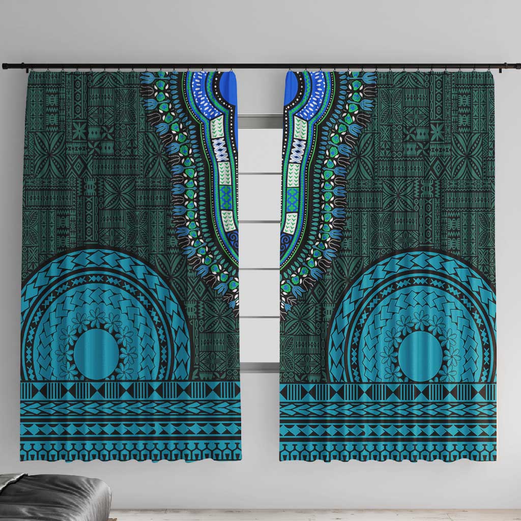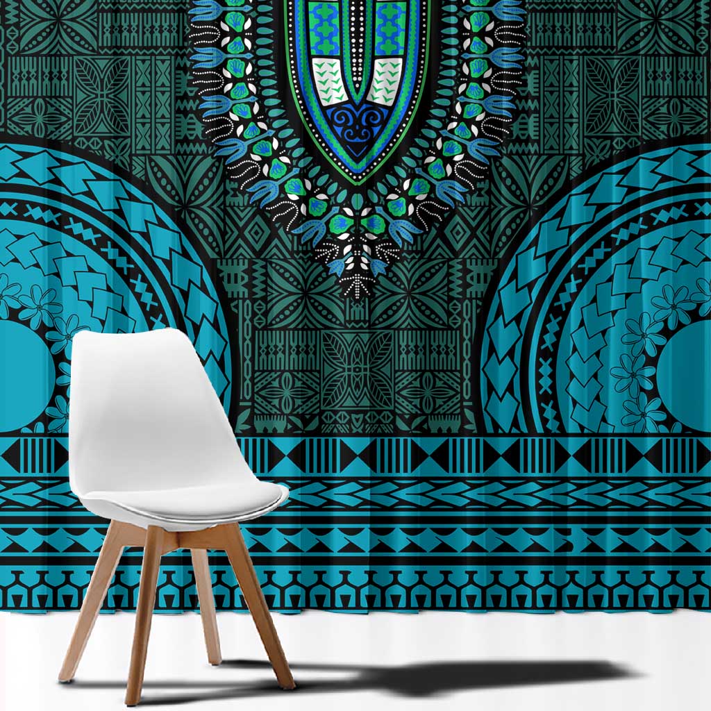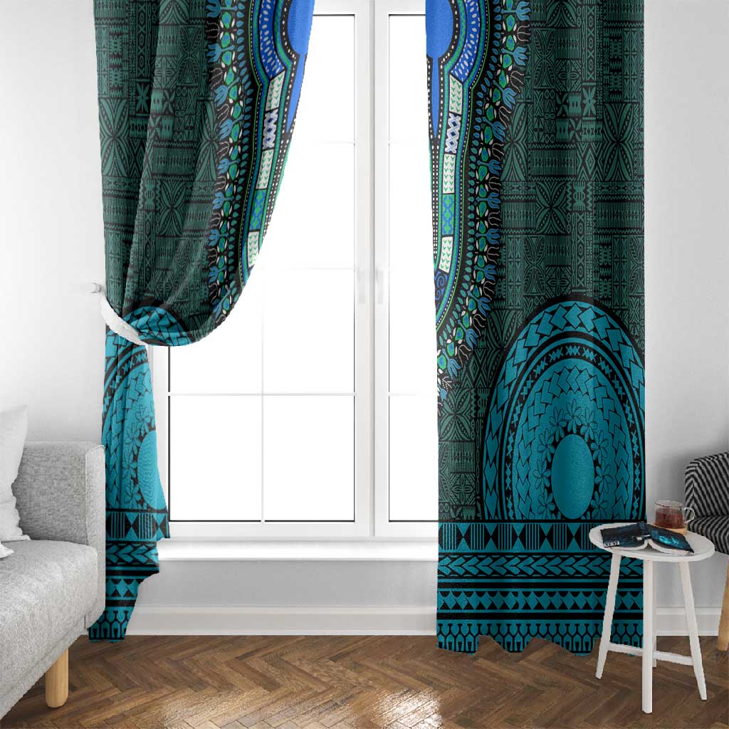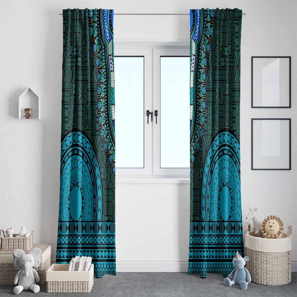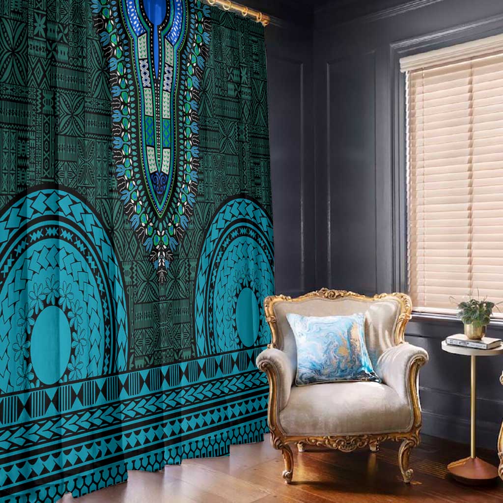 Teal Dashiki and Tapa Pattern Window Curtain Africa-Polynesia Together Culture