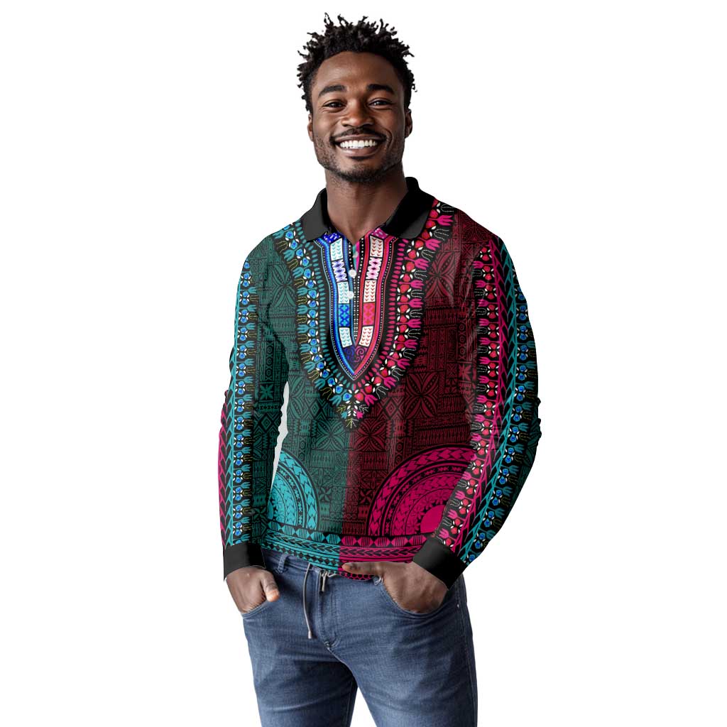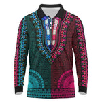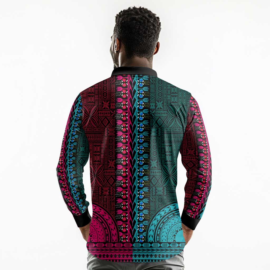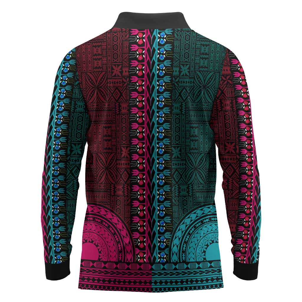 Teal-pink Dashiki and Tapa Pattern Long Sleeve Polo Shirt Africa-Polynesia Together Culture