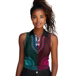 Teal-pink Dashiki and Tapa Pattern Women Sleeveless Polo Shirt Africa-Polynesia Together Culture