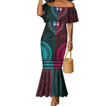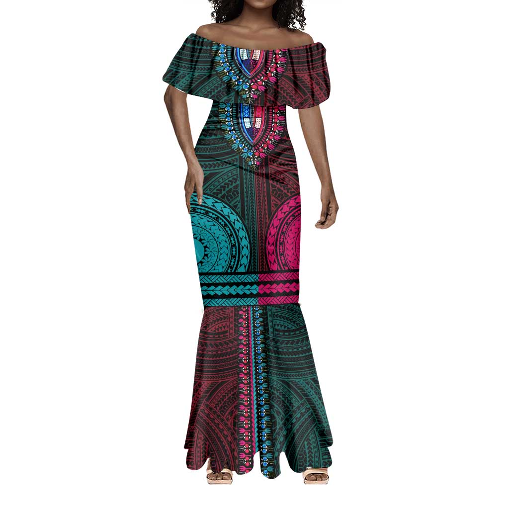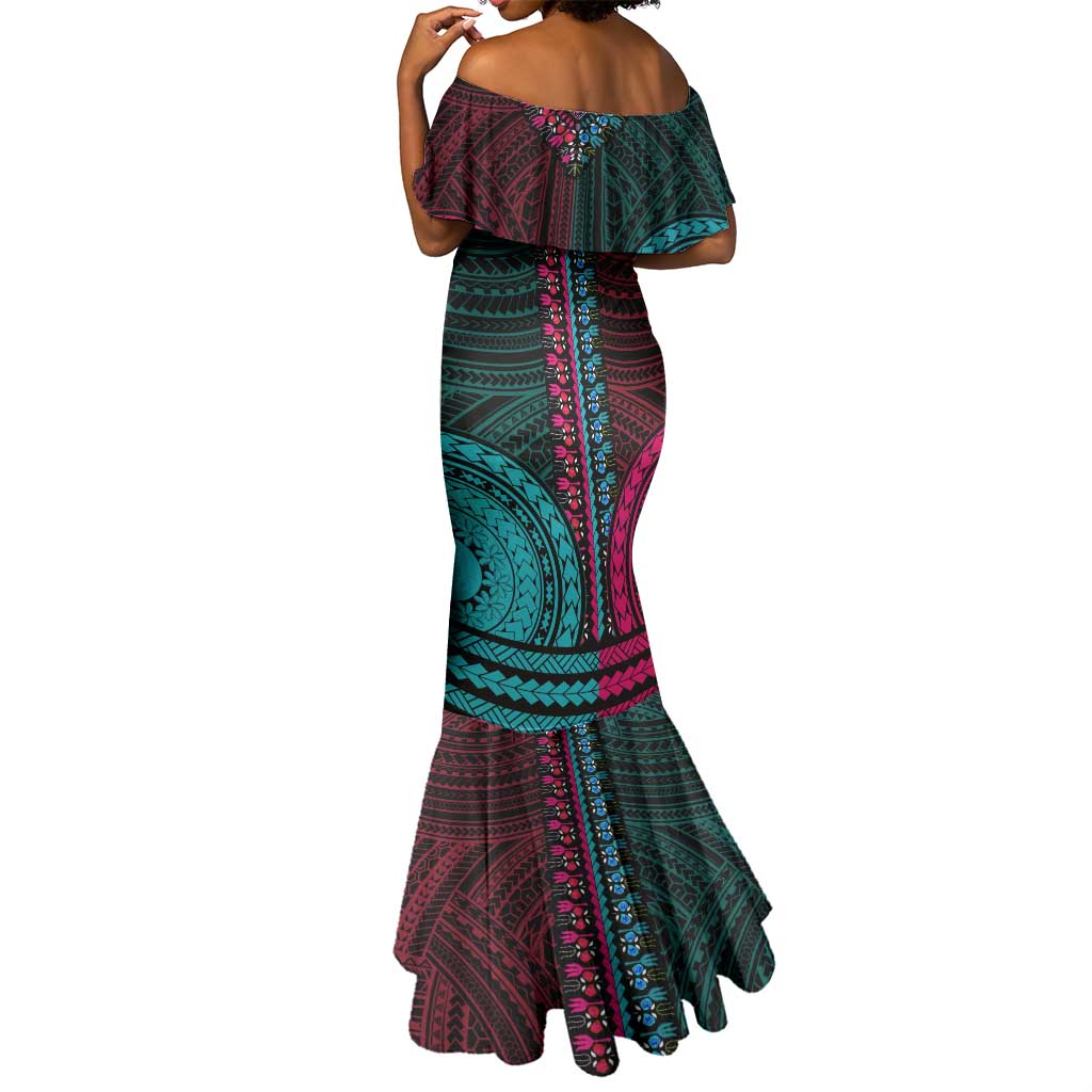 African Dashiki and Polynesian Pattern Mermaid Dress Half Teal-Pink