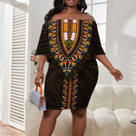 African Dashiki and Polynesian Pattern Off Shoulder Short Dress Gold