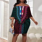 African Dashiki and Polynesian Pattern Off Shoulder Short Dress Half Teal-Pink