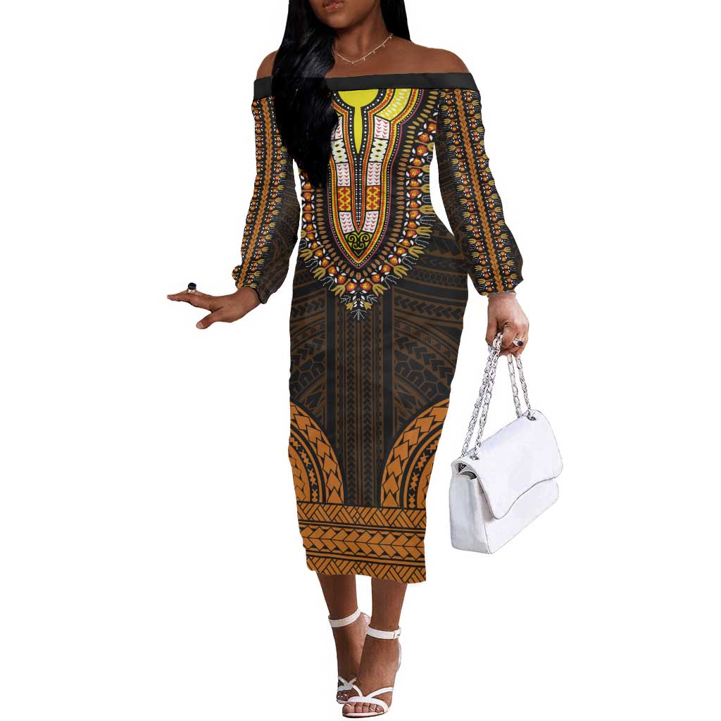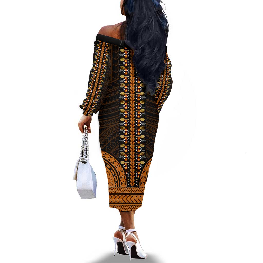 African Dashiki and Polynesian Pattern Off The Shoulder Long Sleeve Dress Gold