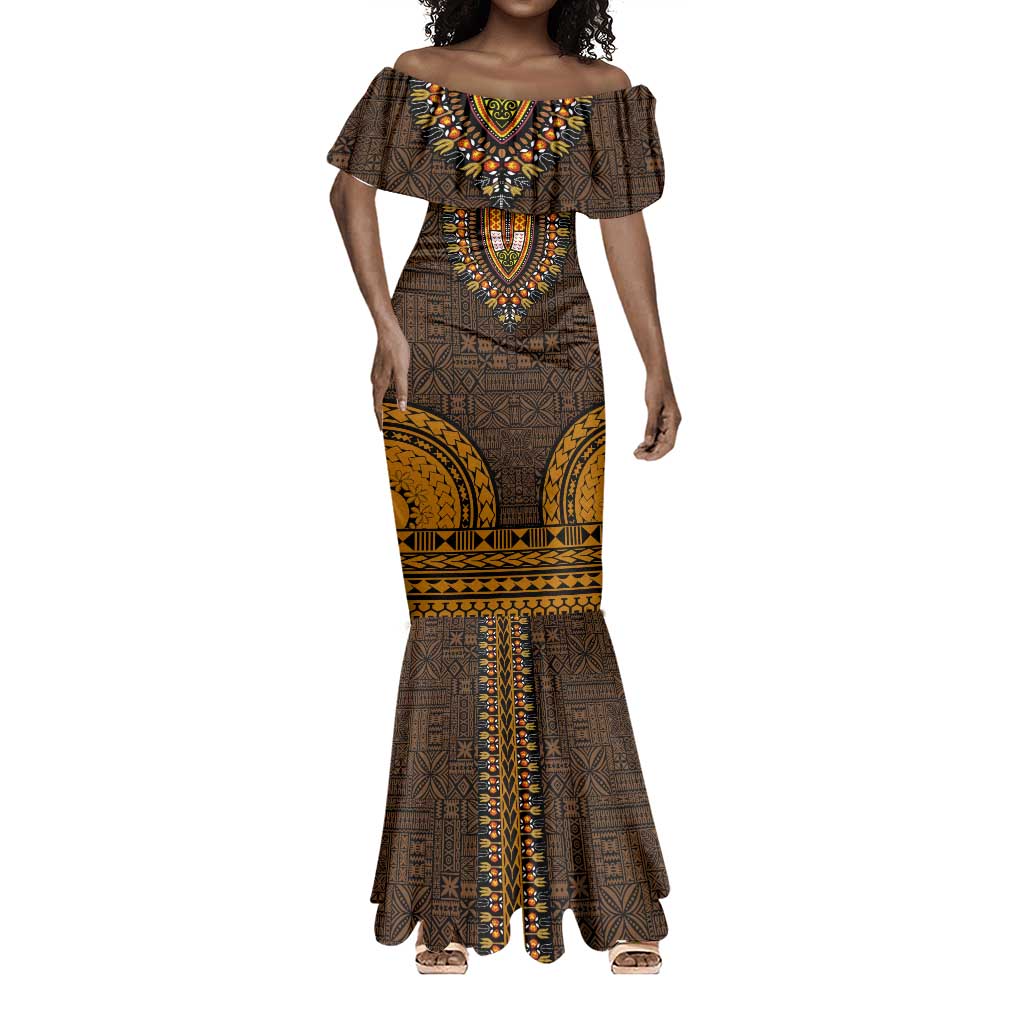 Gold Dashiki and Tapa Pattern Mermaid Dress Africa-Polynesia Together Culture