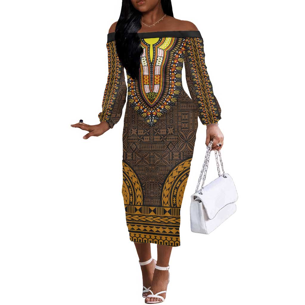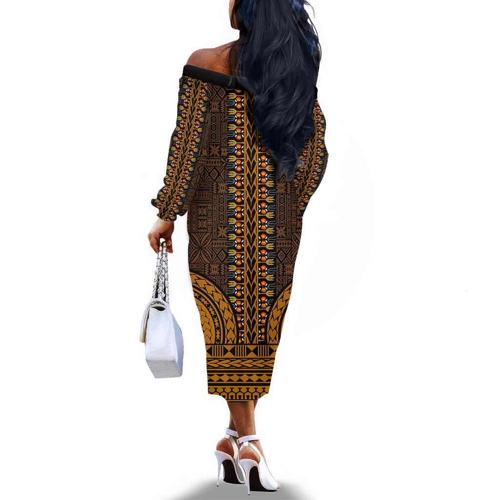 Gold Dashiki and Tapa Pattern Off The Shoulder Long Sleeve Dress Africa-Polynesia Together Culture