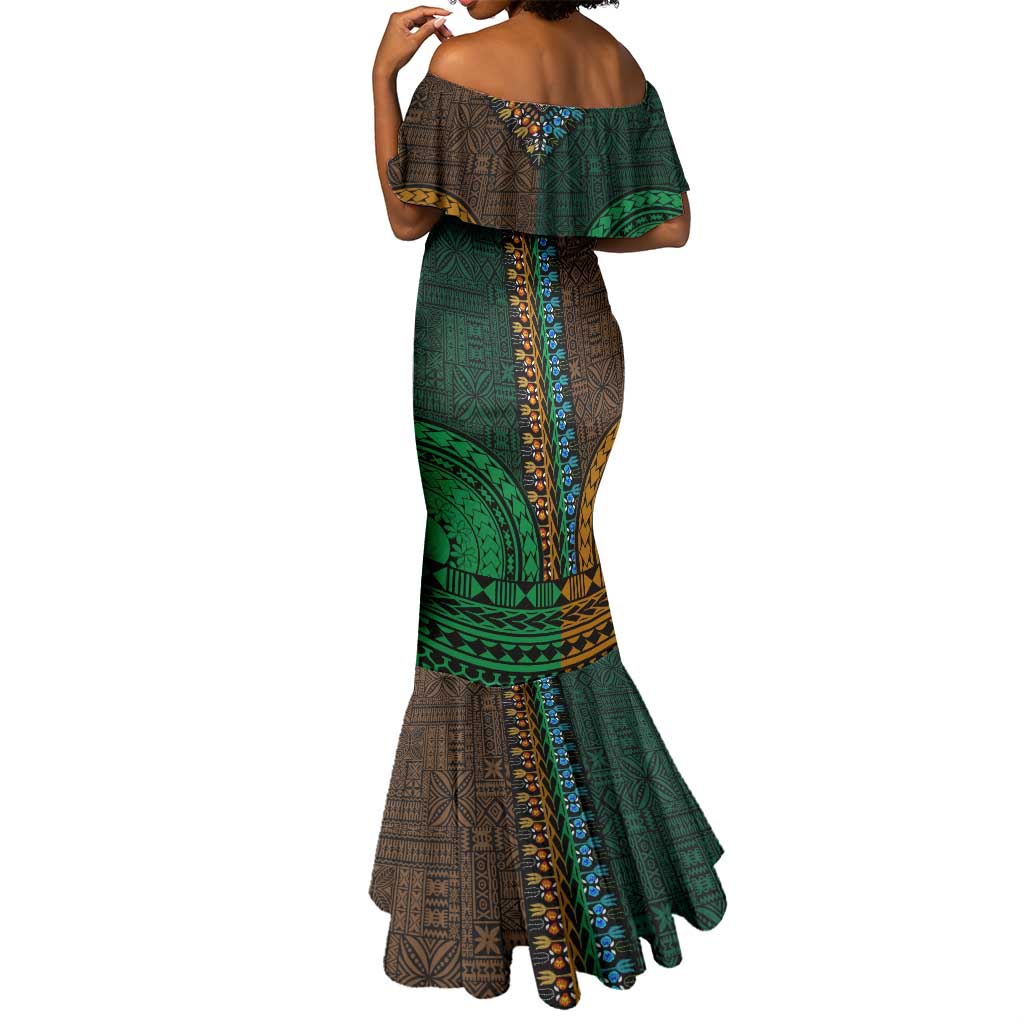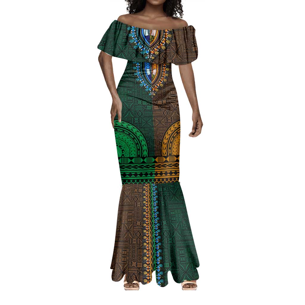 Green-gold Dashiki and Tapa Pattern Mermaid Dress Africa-Polynesia Together Culture