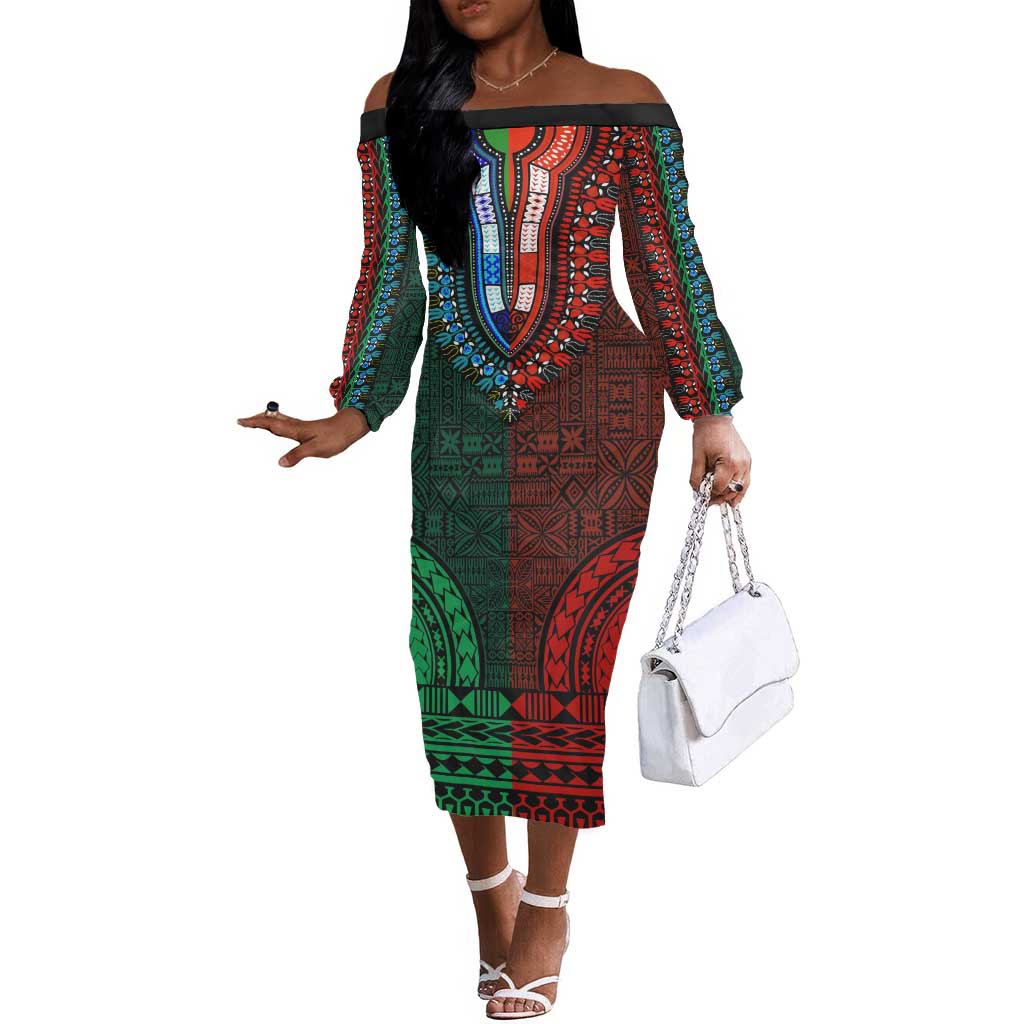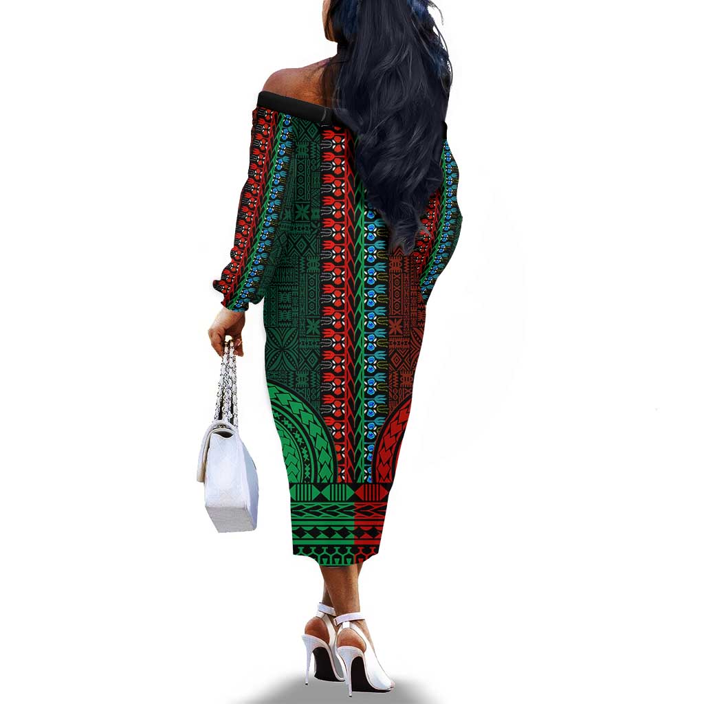 Green-red Dashiki and Tapa Pattern Off The Shoulder Long Sleeve Dress Africa-Polynesia Together Culture