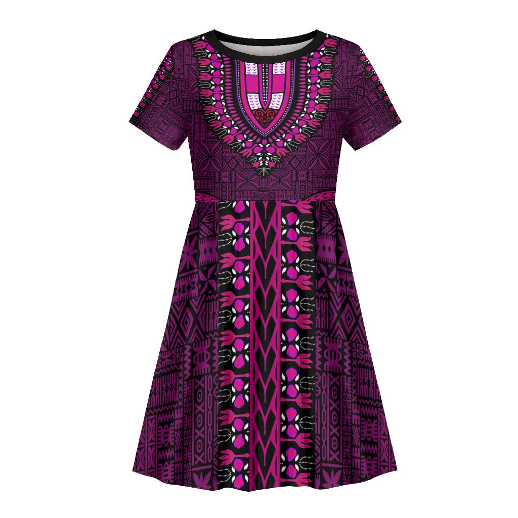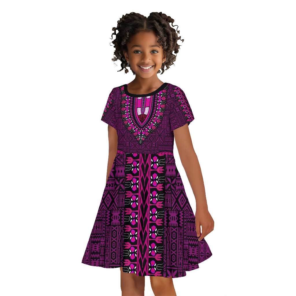 Pink Dashiki and Tapa Pattern Kid Short Sleeve Dress Africa-Polynesia Together Culture