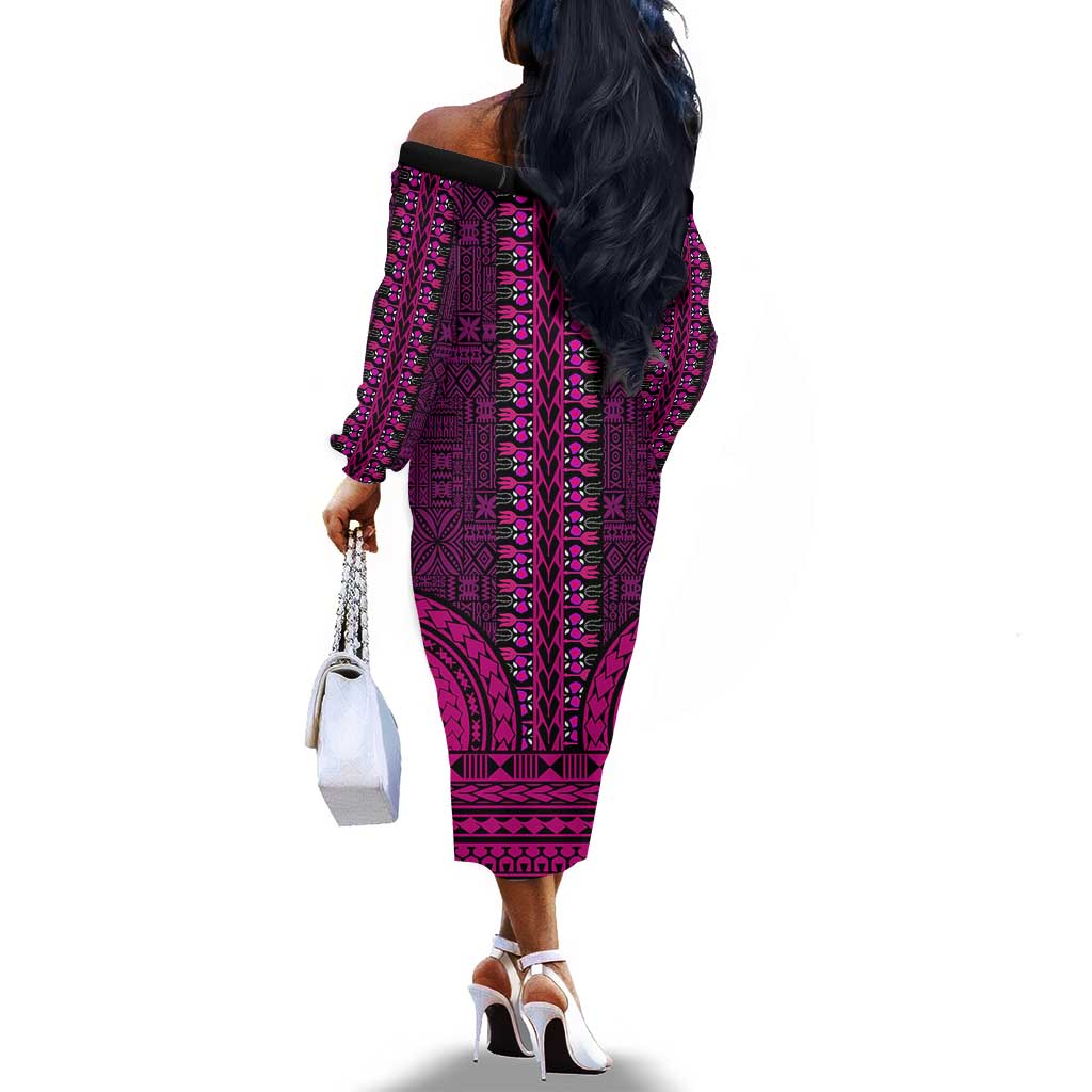 Pink Dashiki and Tapa Pattern Off The Shoulder Long Sleeve Dress Africa-Polynesia Together Culture