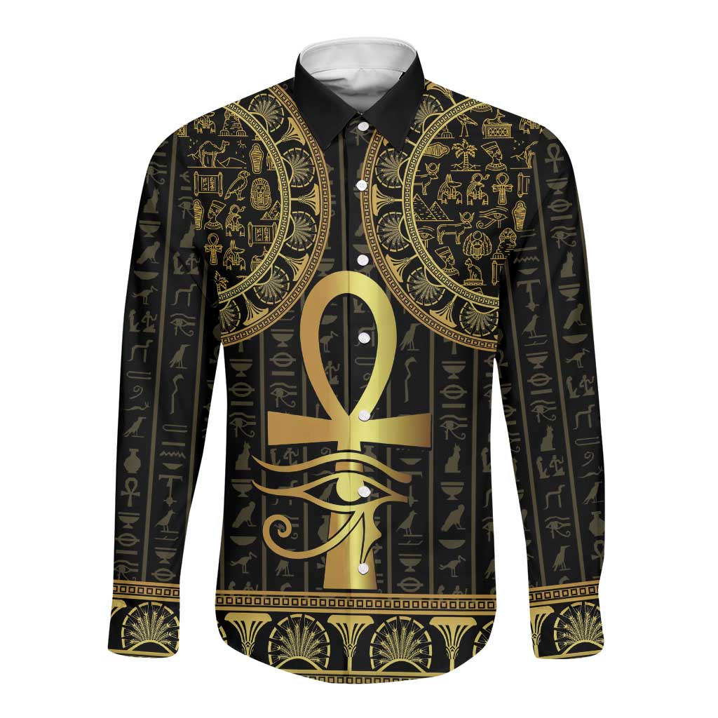 Afro Ancient Egypt Ankh and Eye Of Horus Long Sleeve Button Shirt Egyptian Hieroglyphs