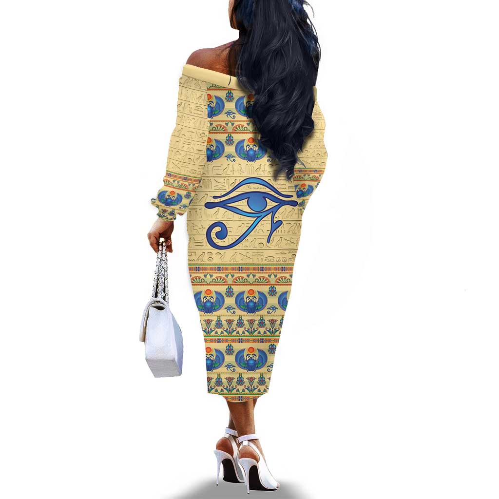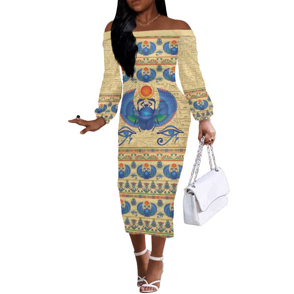 Ancient Egypt Scarab Beetle Off The Shoulder Long Sleeve Dress