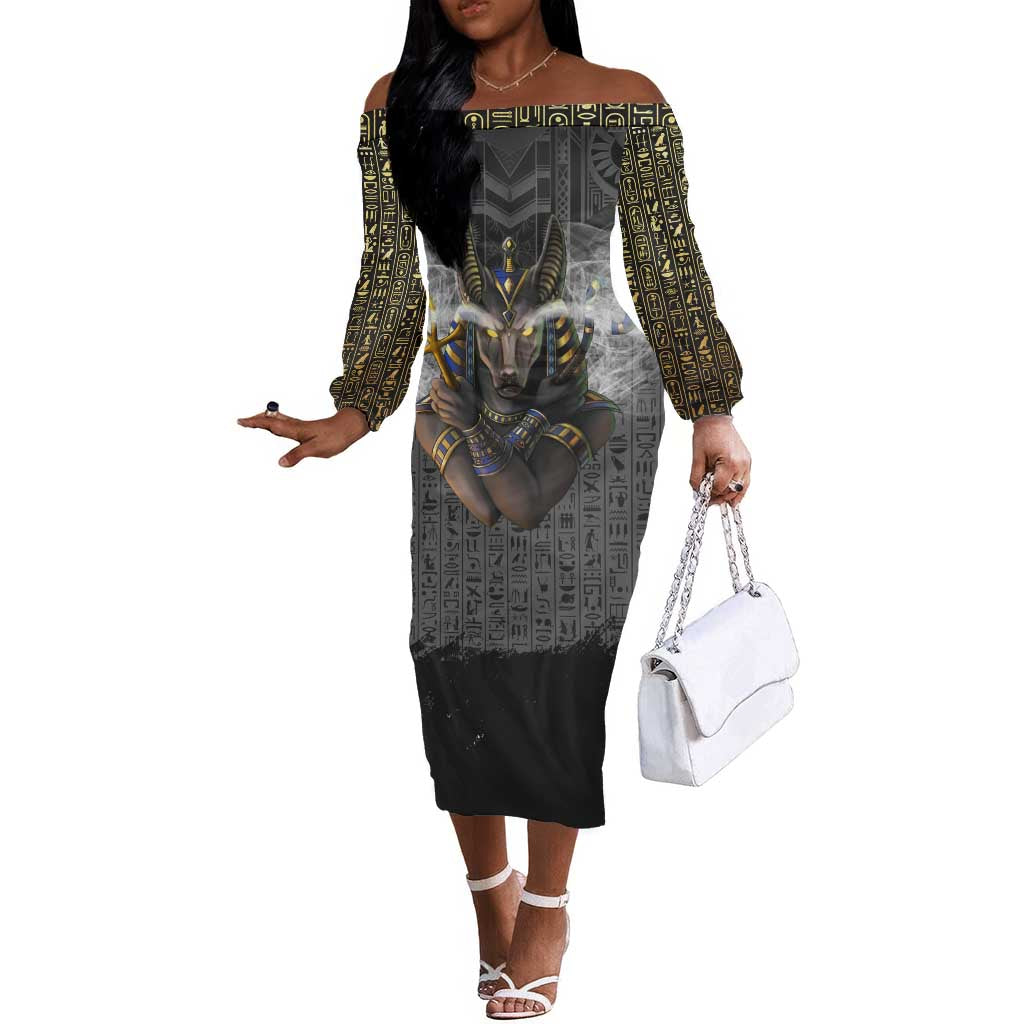 Anubis Off Shoulder Short Dress Egypt Pattern Black