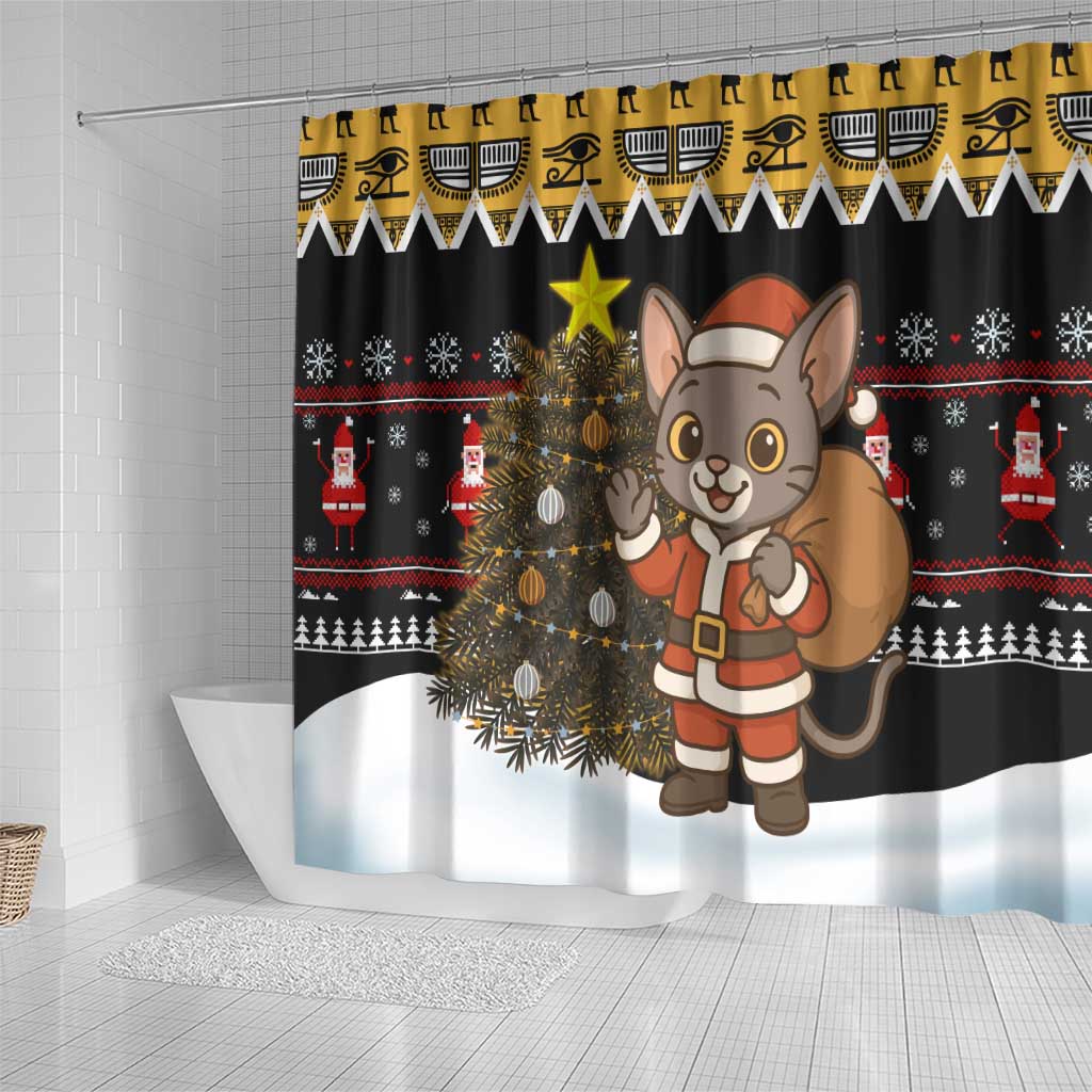 Egypt Christmas Shower Curtain Santa Cat Sleigh Reindeer Christmas Tree and Ancient Hieroglyphic