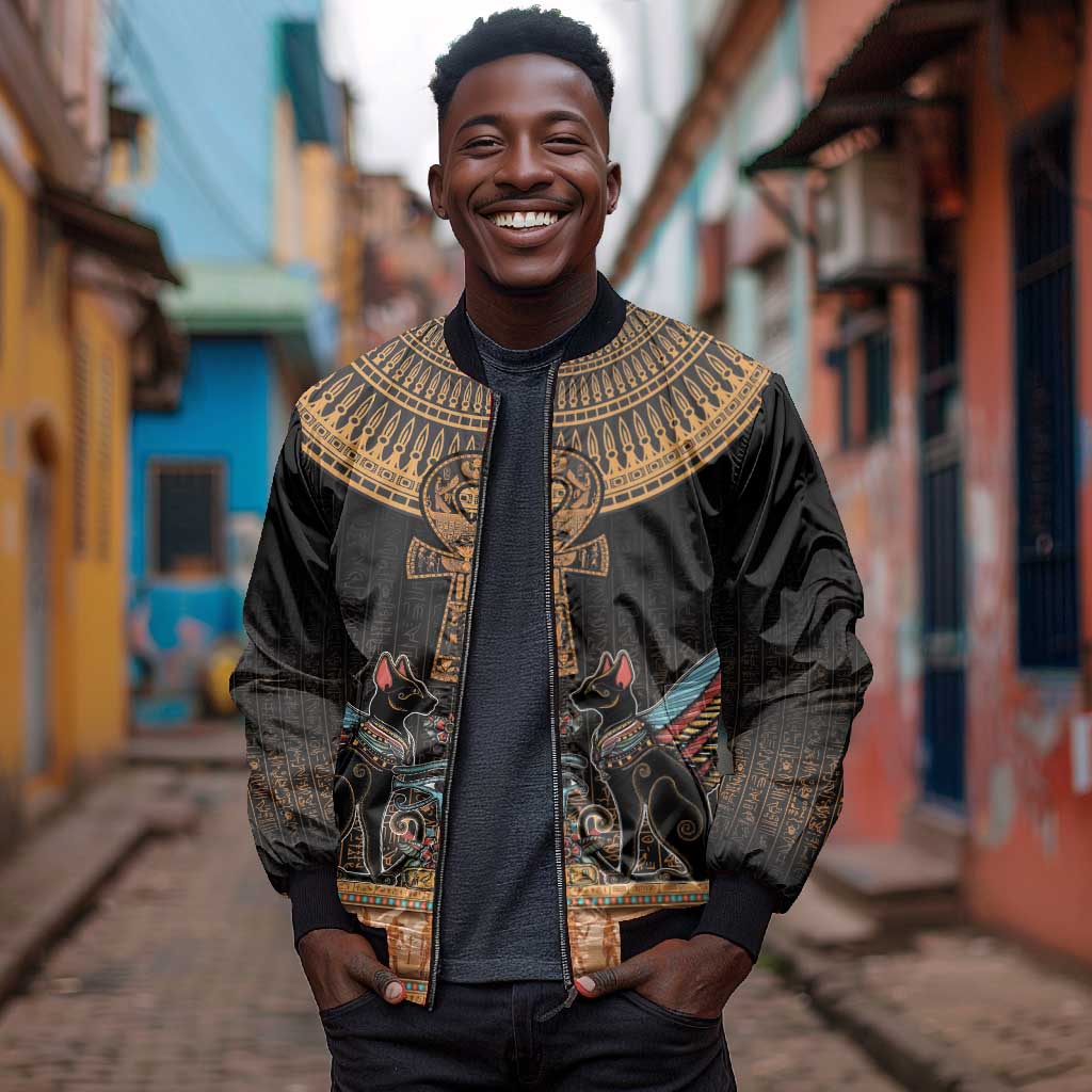 Winged Egypt Cats Bomber Jacket Hieroglyphs Alphabet Pattern