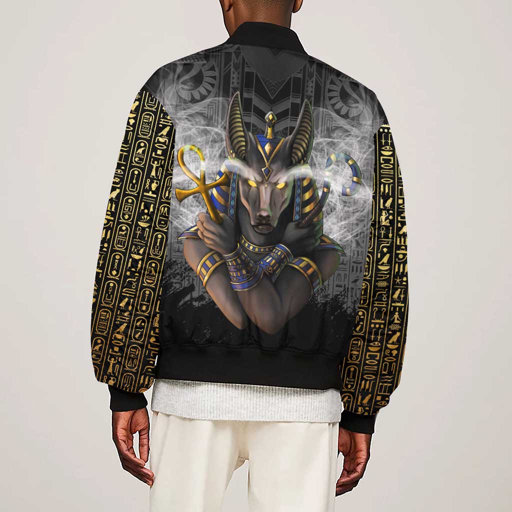Anubis Sleeve Zip Bomber Jacket Egypt Pattern Black