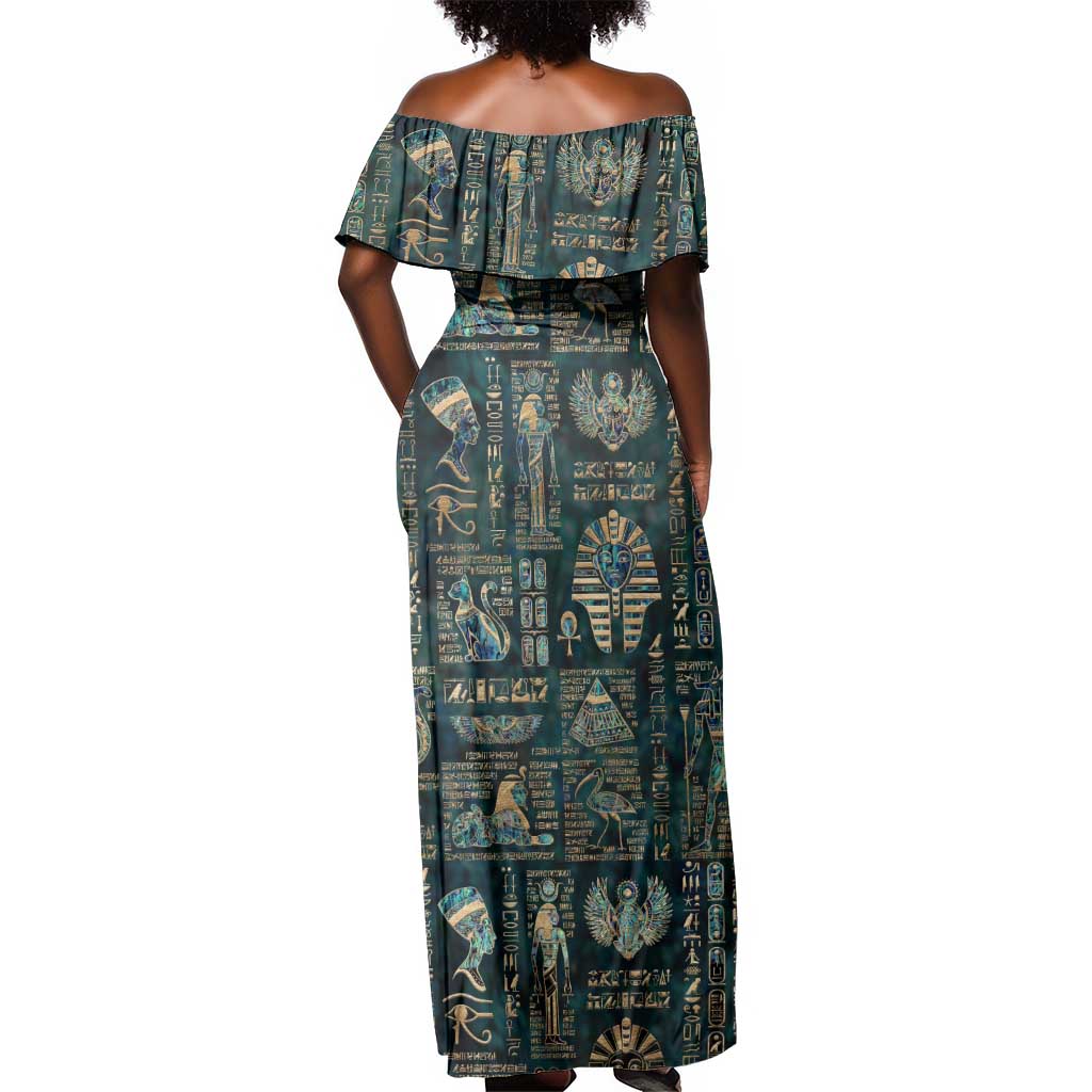Egyptian Hieroglyphs And Deities Off Shoulder Maxi Dress