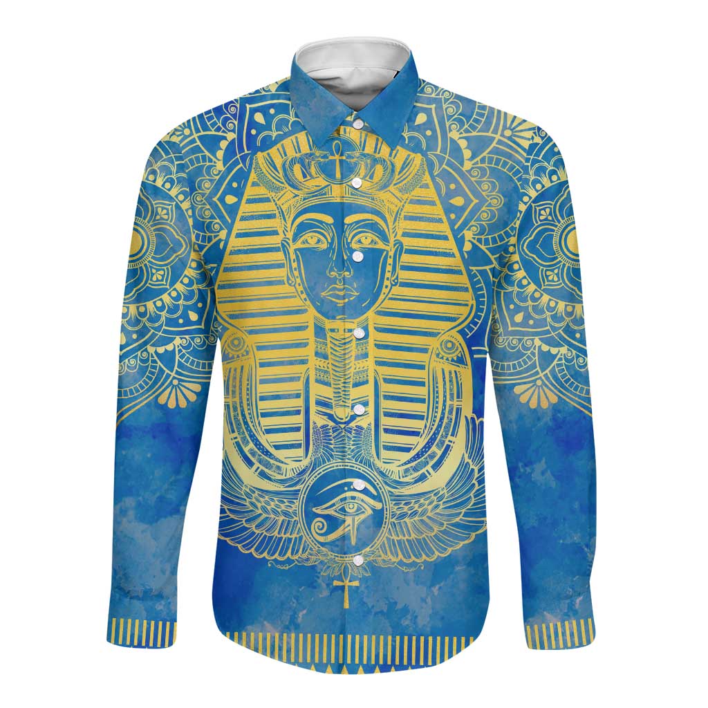 Personalized Egyptian Pharaoh Long Sleeve Polo Shirt with Mandala and Eye of Horus in Blue