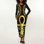 Afro Ancient Egypt Ankh and Eye Of Horus Long Sleeve Bodycon Dress Egyptian Hieroglyphs