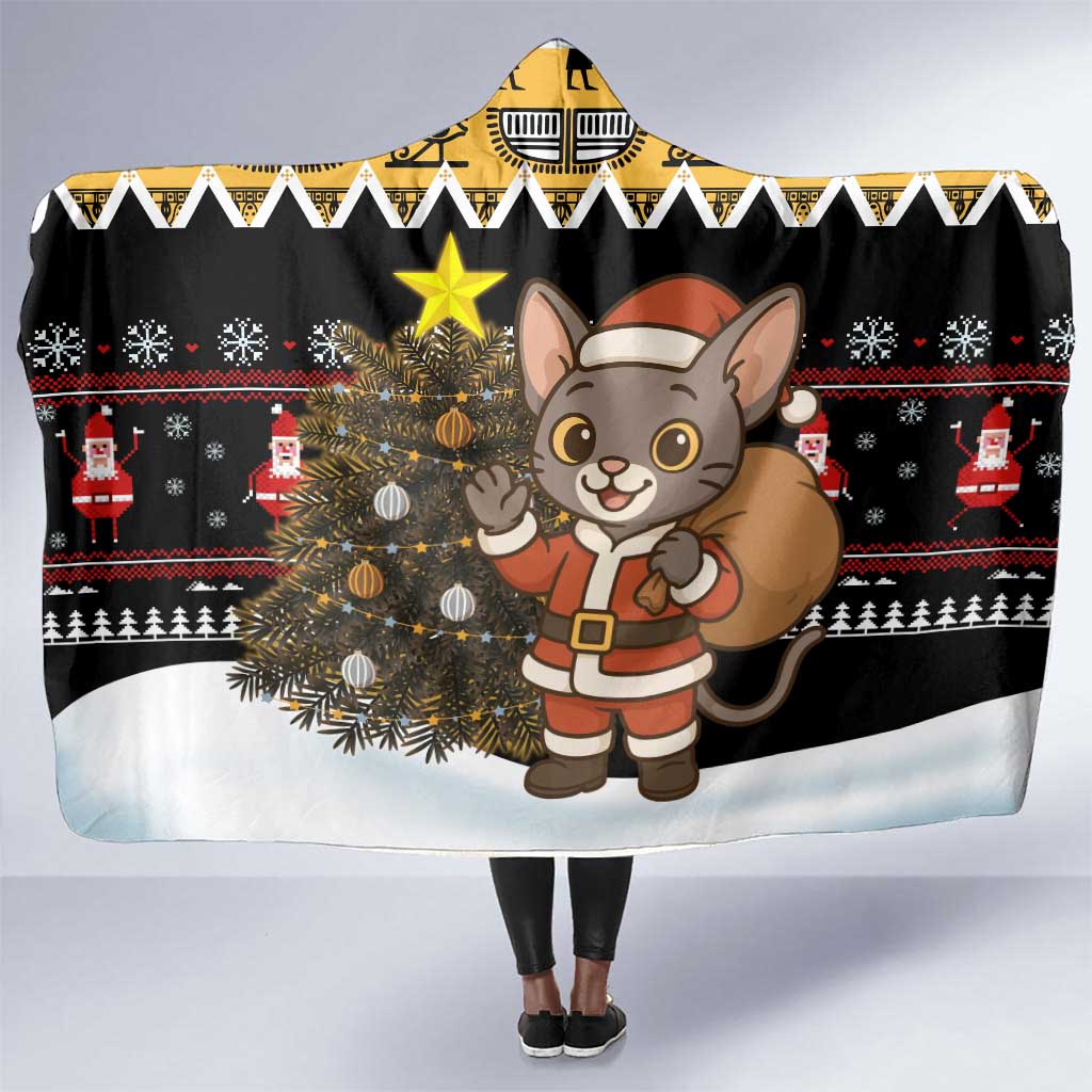 Egypt Christmas Hooded Blanket Santa Cat Sleigh Reindeer Christmas Tree and Ancient Hieroglyphic