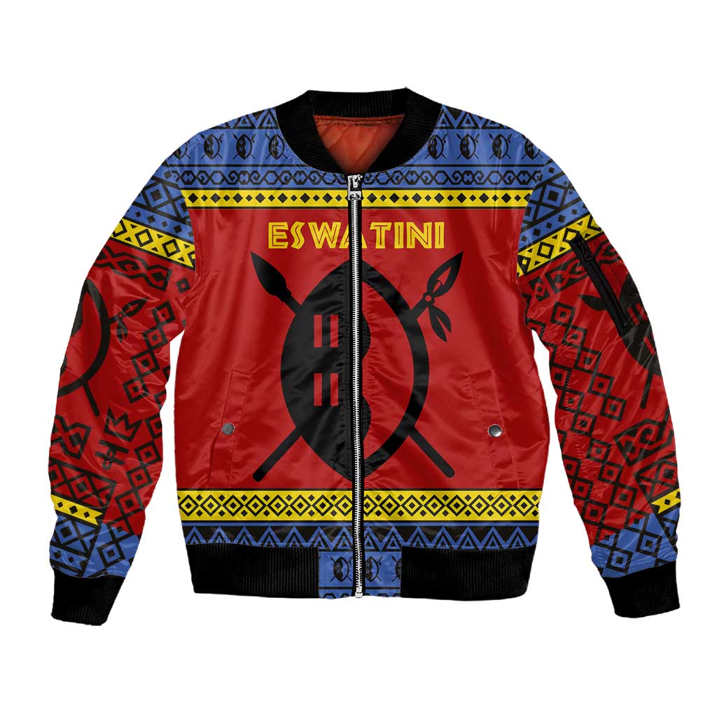 Eswatini Flag Sleeve Zip Bomber Jacket Nguni Shield Spear Pattern
