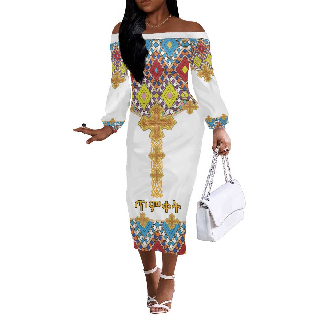 Happy Ethiopian Timkat Off The Shoulder Long Sleeve Dress Cross Mix Tilet Pattern