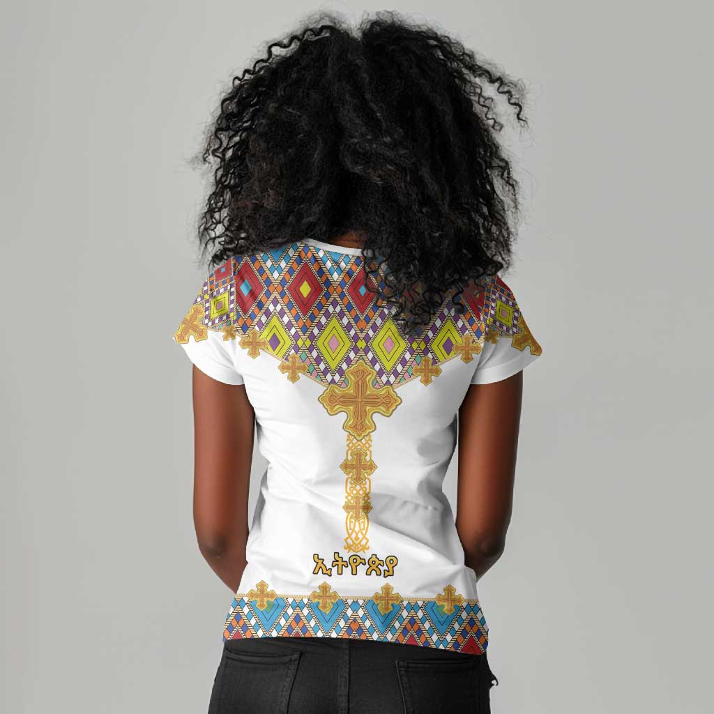 Happy Ethiopian Timkat Women V-Neck T-Shirt Cross Mix Tilet Pattern
