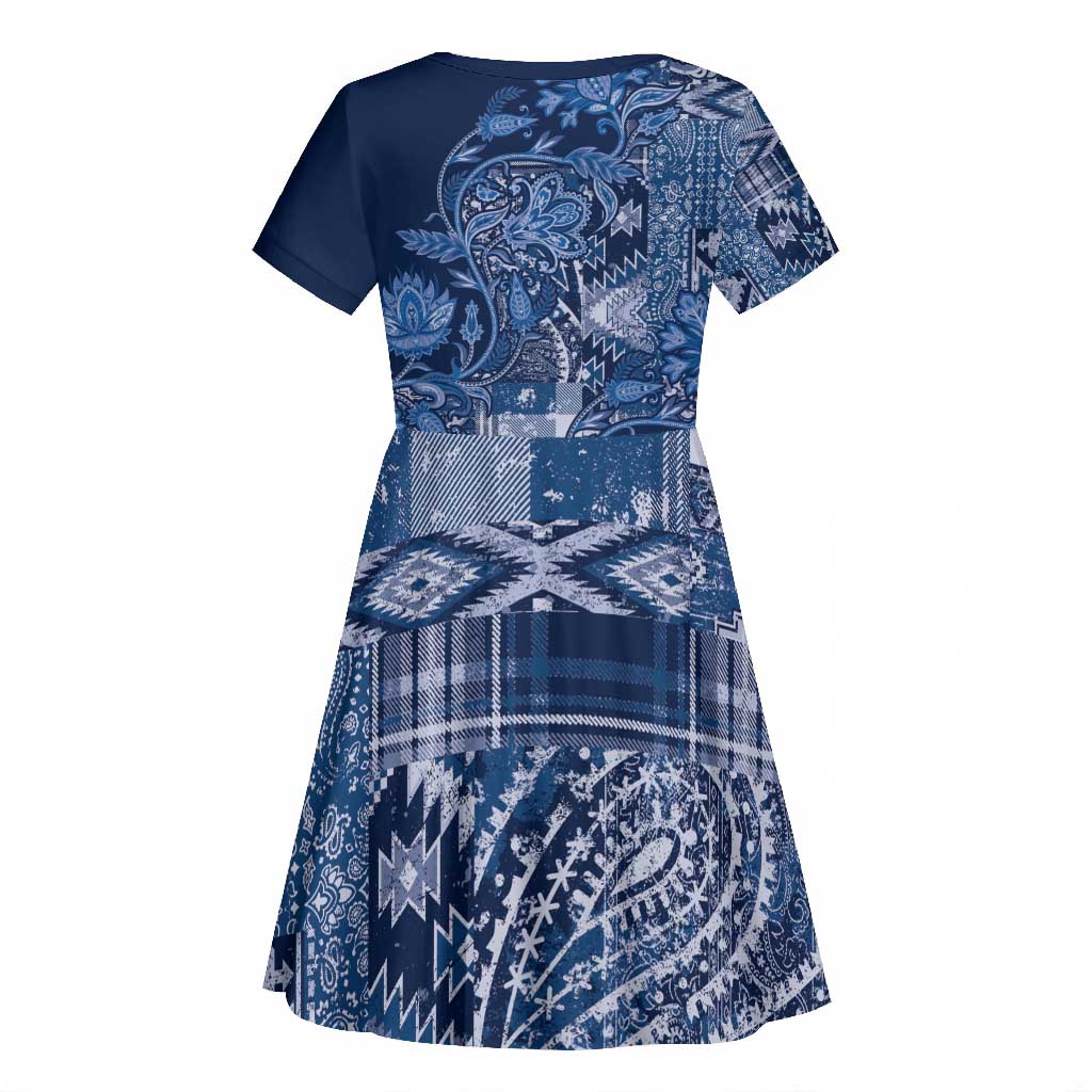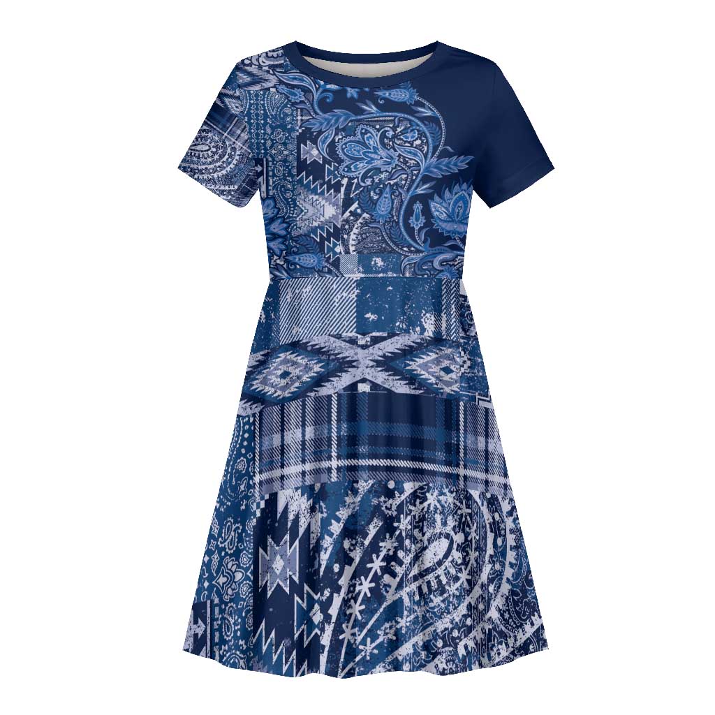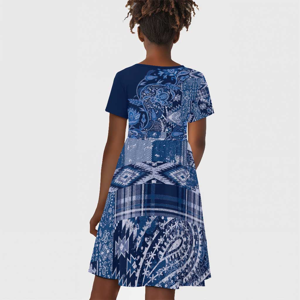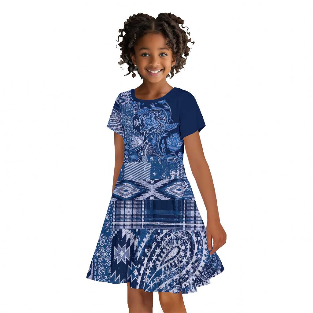 Afro Floral mix Maasai Shuka Kid Short Sleeve Dress Blue Moitf