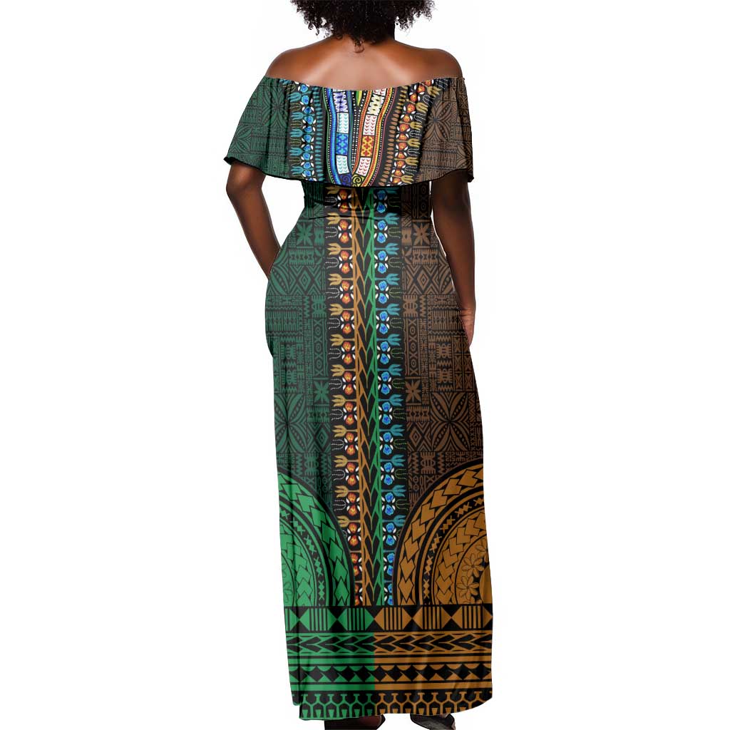 Green-gold Dashiki and Tapa Pattern Off Shoulder Maxi Dress Africa-Polynesia Together Culture