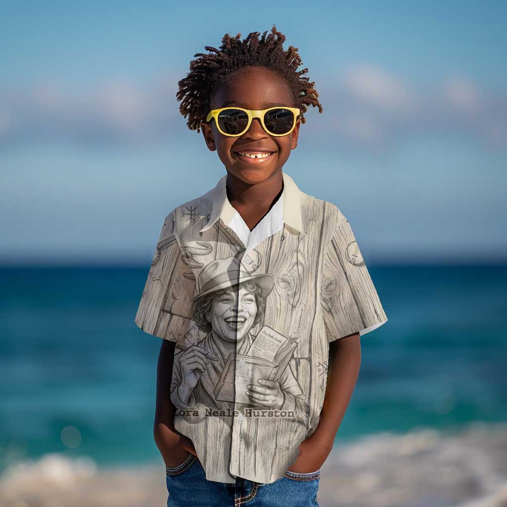 Zora Neale Hurston Kid Hawaiian Shirt Rustic Wood Engraved Style Illustration Joyful Portrait with Book and Map Donkey