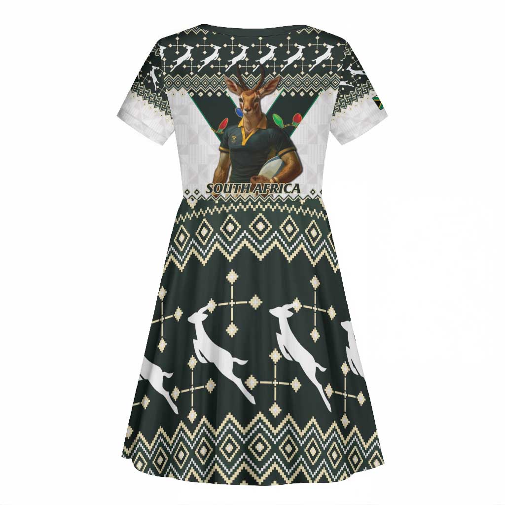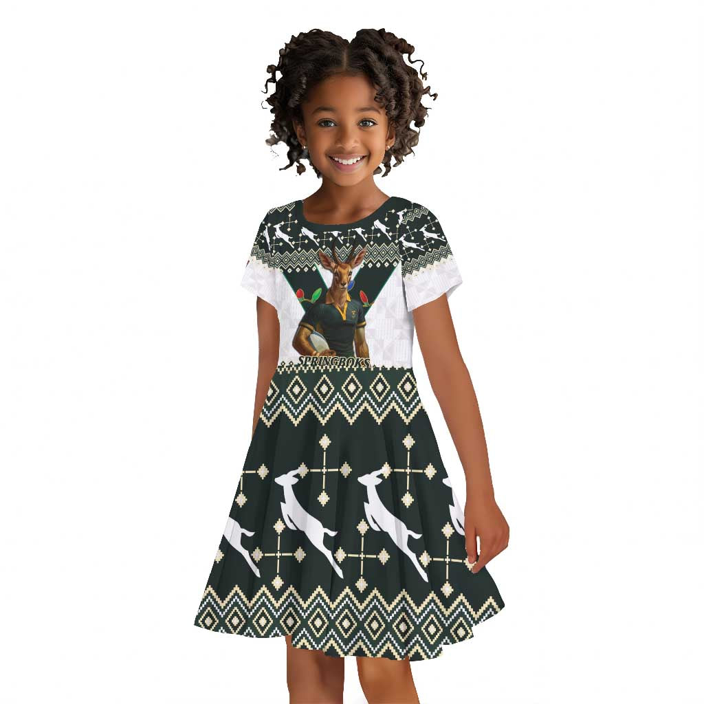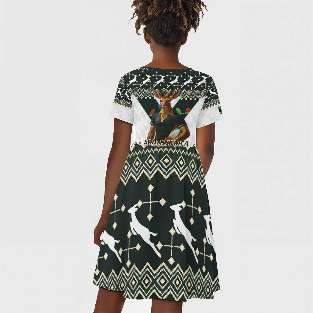 South Africa Christmas Rugby Kid Short Sleeve Dress Springboks Mascot Mix African Pattern