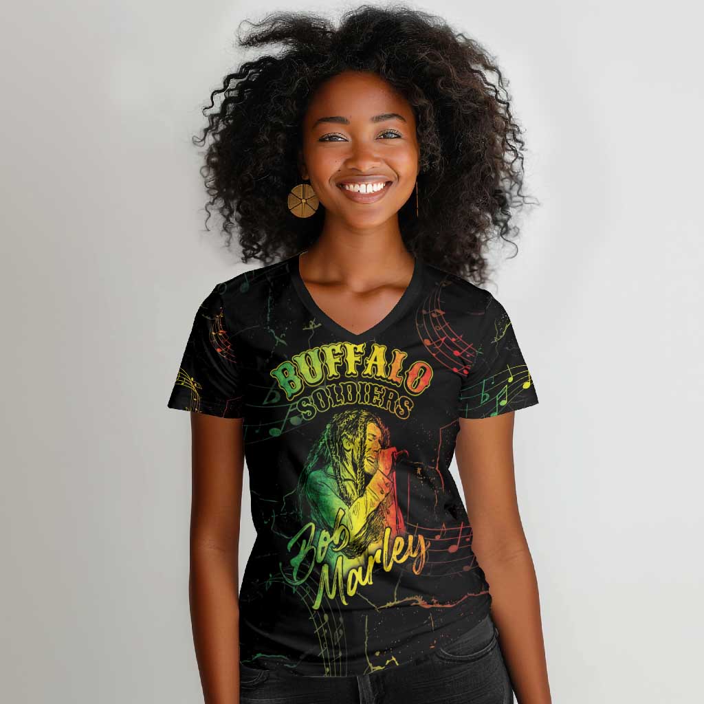 Reggae King Buffalo Soldier Women V-Neck T-Shirt Honoring The Legend LT05