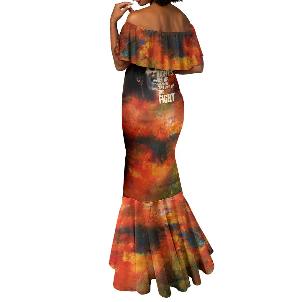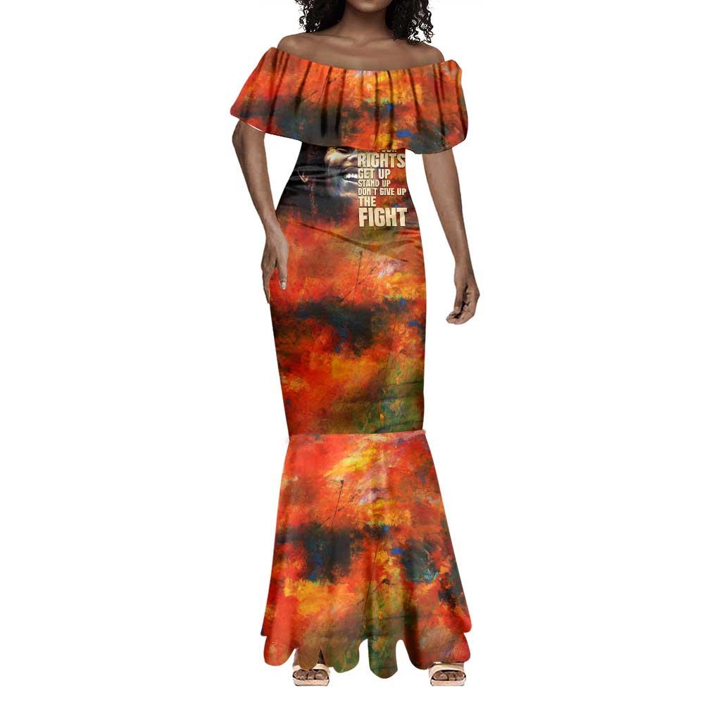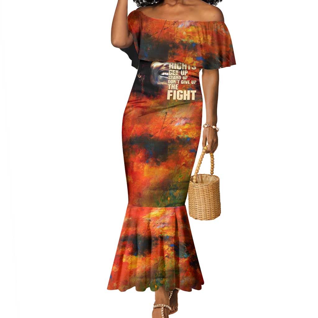 Design: Off-the-shoulder design with a body-hugging fit that flares out at the bottom, creating a stunning mermaid silhouette. Features vibrant, intricate patterns as shown in the pictures.