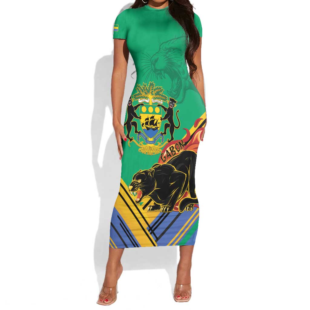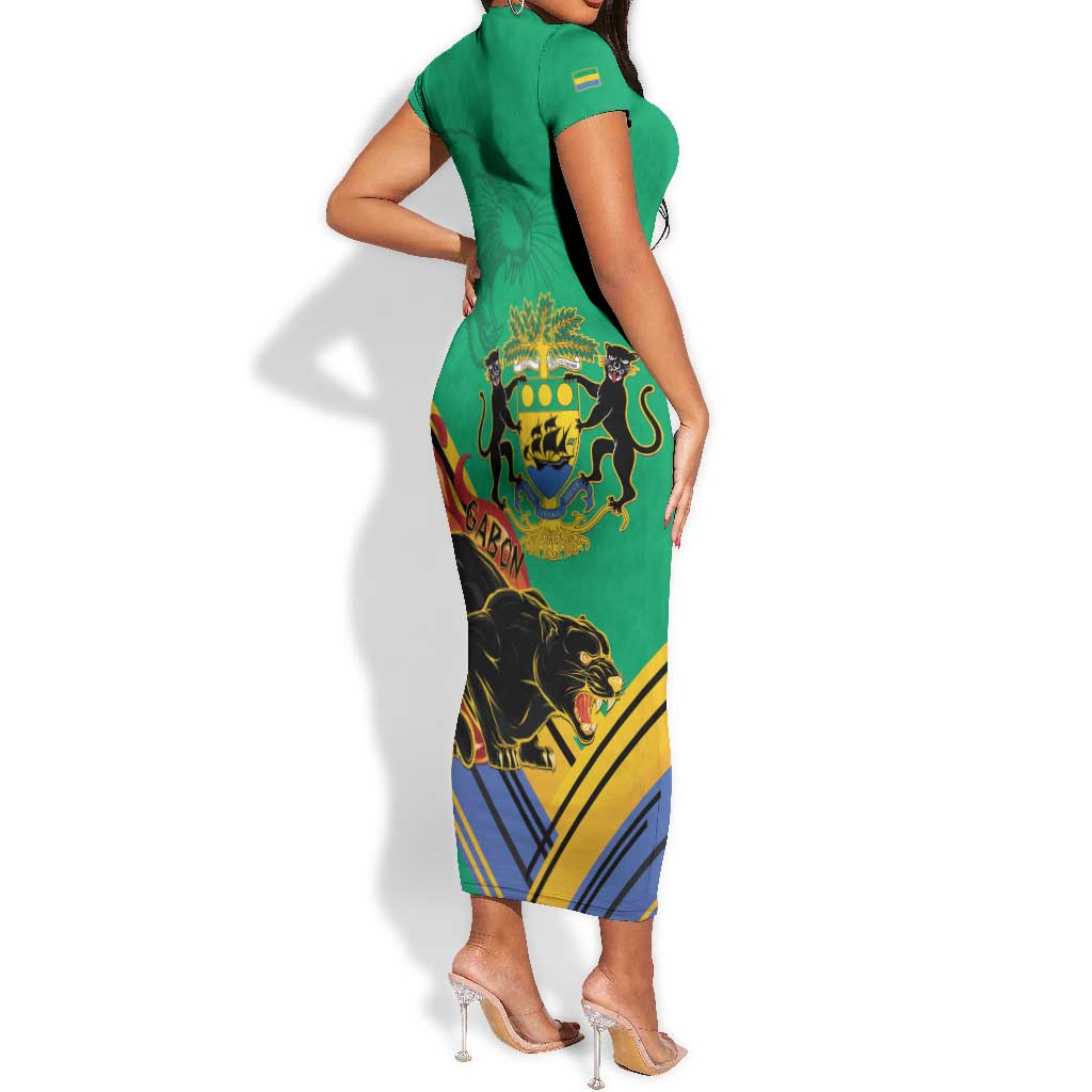 Afro Gabon Short Sleeve Bodycon Dress Black Panther With Coat Of Arms