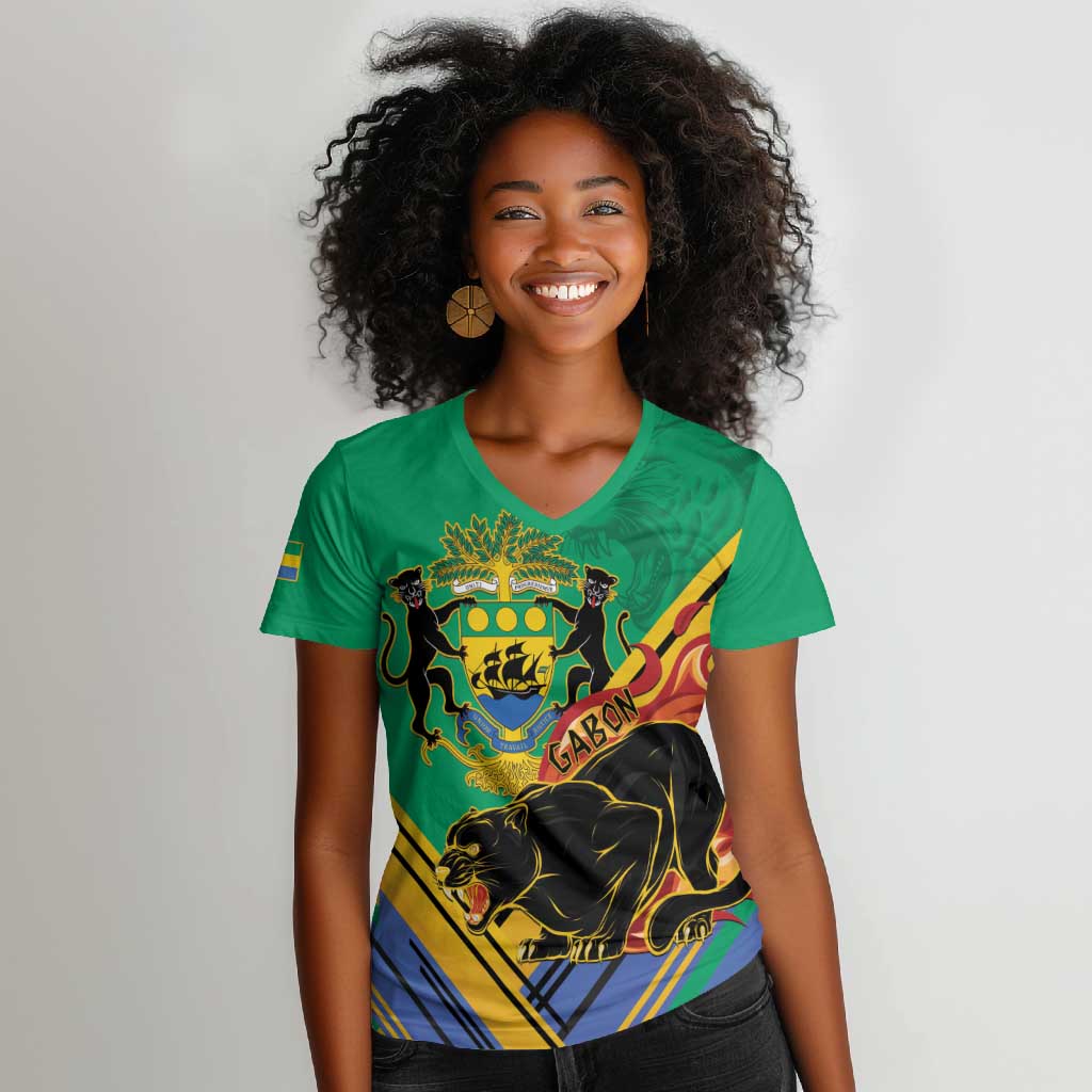 Afro Gabon Women V-Neck T-Shirt Black Panther With Coat Of Arms