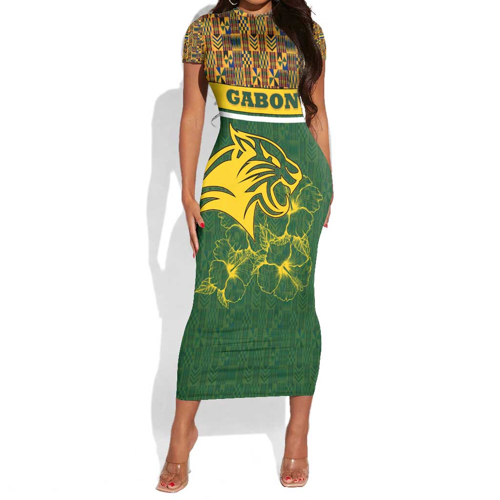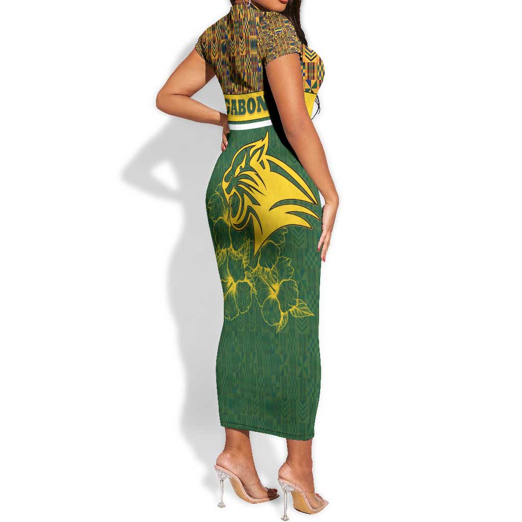 Gabon Short Sleeve Bodycon Dress - Tribal Print and Fierce Panther Graphic in National Flag Colors