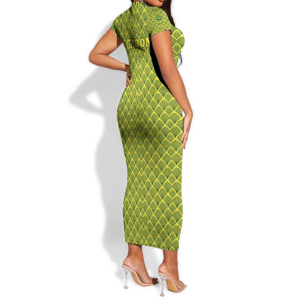 Gabon Tribal Pattern Short Sleeve Bodycon Dress - National Flag Colors and Bold Text Design