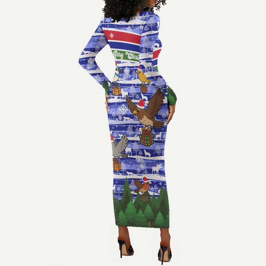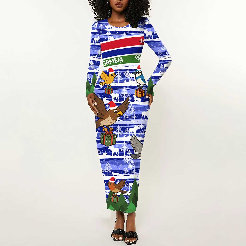 Gambia Christmas Long Sleeve Bodycon Dress Santa Birds Gift Boxes Forest Scene and Snowflake