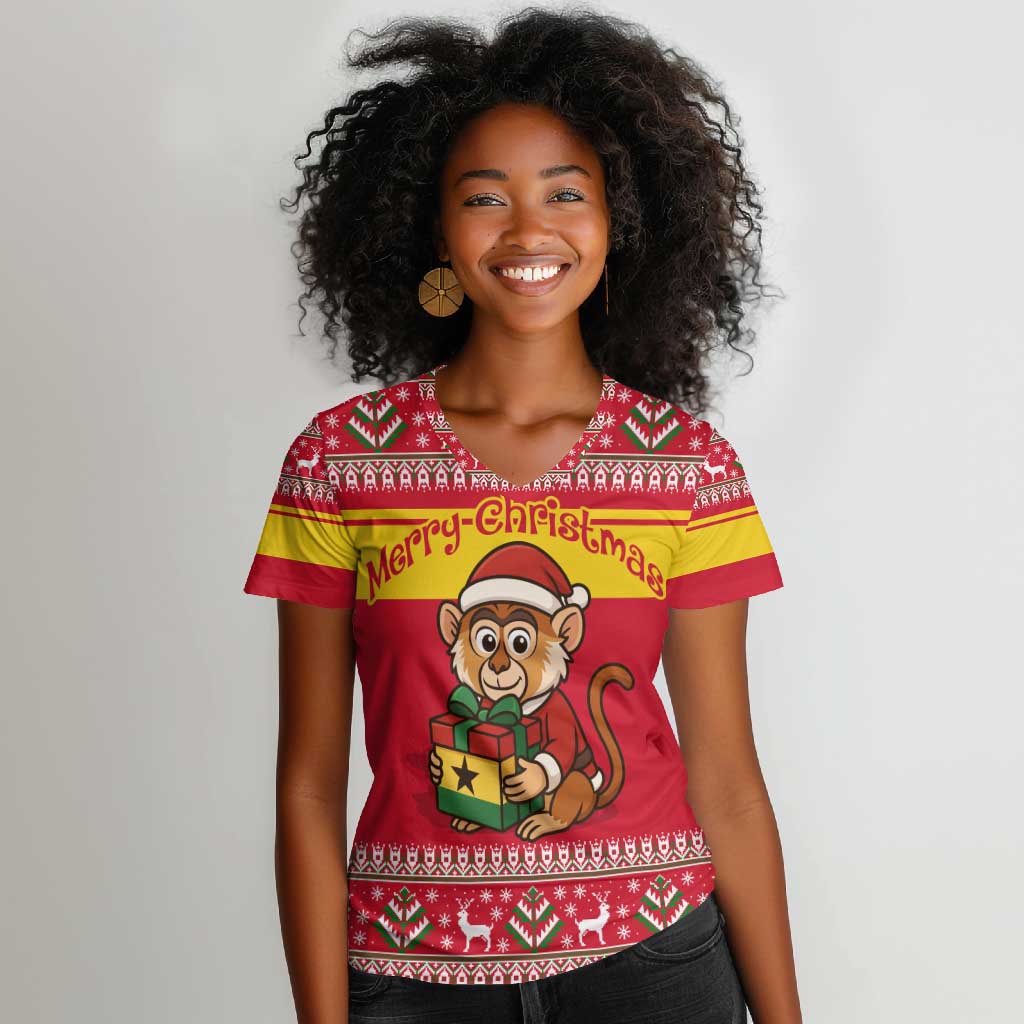Ghana Christmas Women V-Neck T-Shirt Monkey Holding Gift Ghana Map and Festive