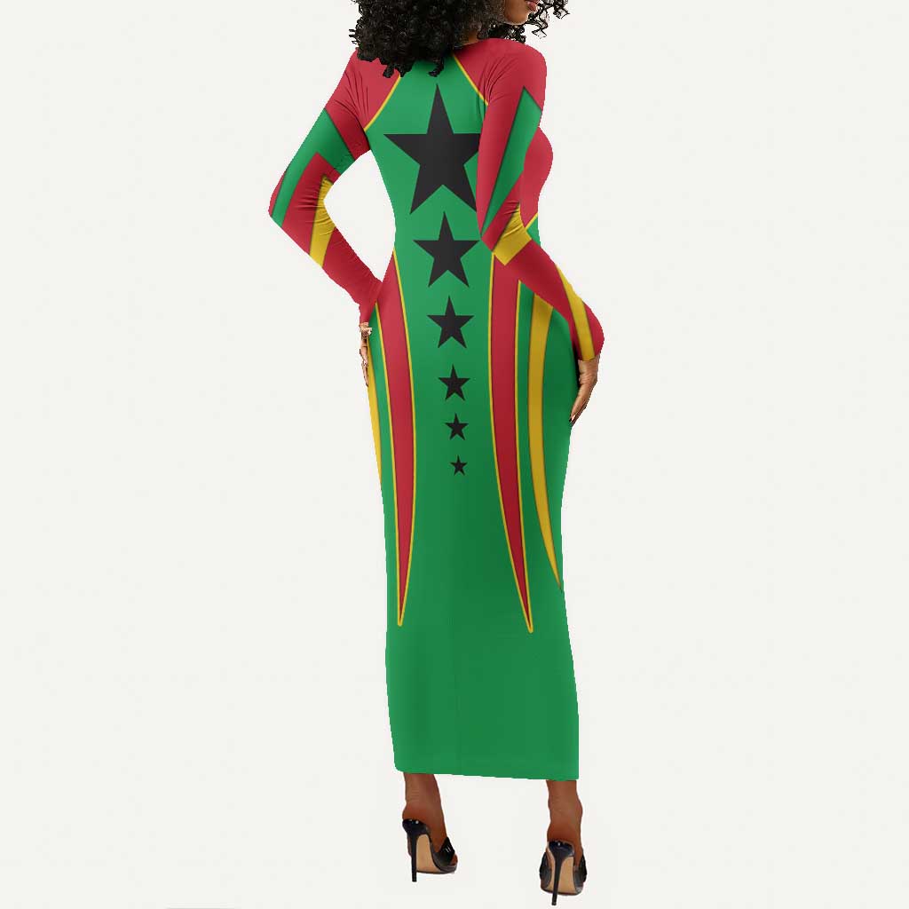Guinea Bissau Long Sleeve Bodycon Dress Red Green Yellow Stripe Design and Black Star