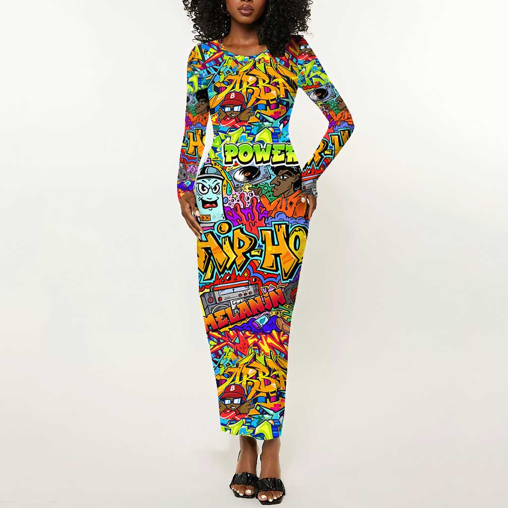 Hip Hop Graffiti Art Long Sleeve Bodycon Dress Black Power DT02