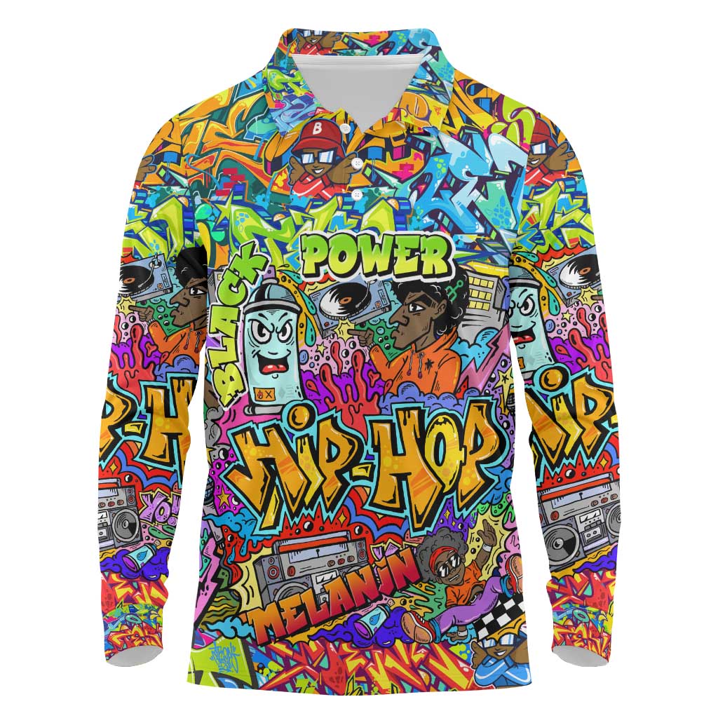 Hip Hop Graffiti Art Long Sleeve Polo Shirt Black Power DT02