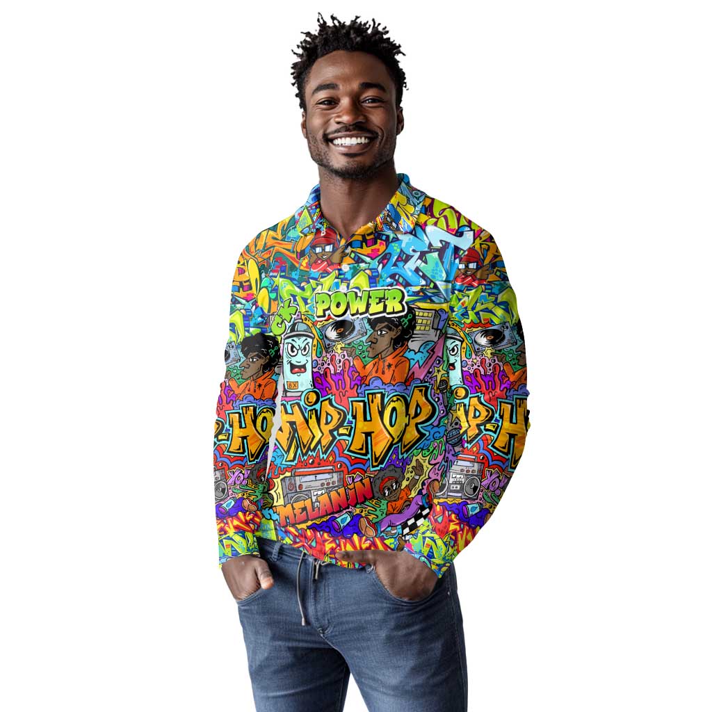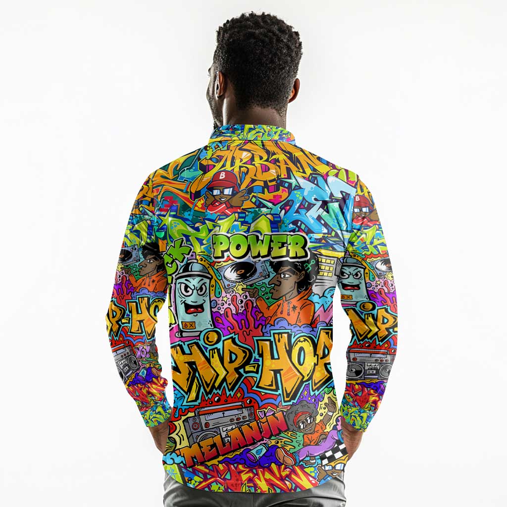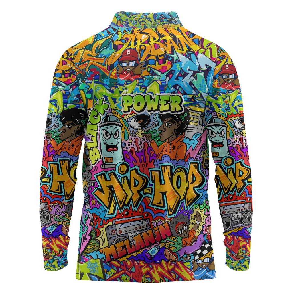 Hip Hop Graffiti Art Long Sleeve Polo Shirt Black Power