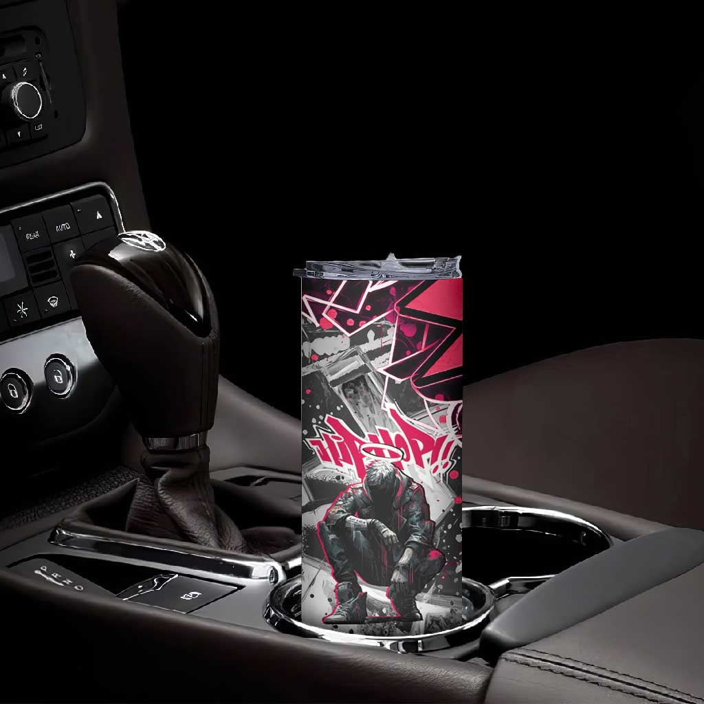 Hip Hop Graffiti Design Skinny Tumbler Sitting Hooded Figure and Red Black Street