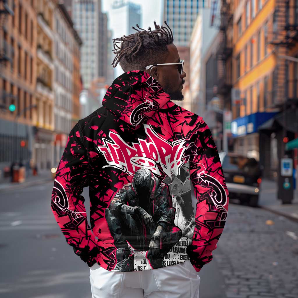 Hip Hop Graffiti Design Zip Hoodie Sitting Hooded Figure and Red Black Street