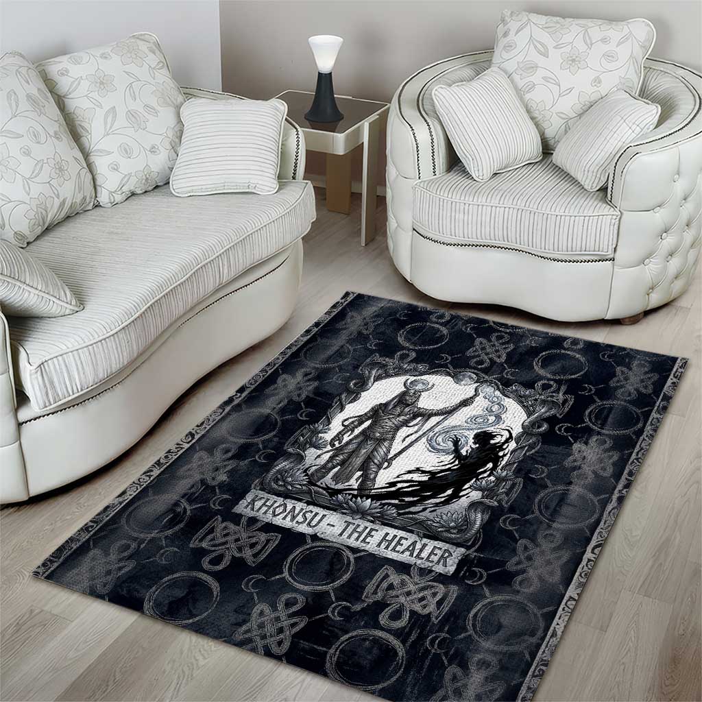 Khonsu Ancient Egyptian Area Rug with Dark Celtic Knot Pattern, Baboon Guardian Symbol, and Moon Healer Motif