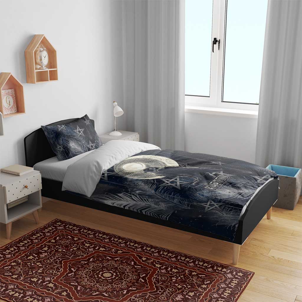 Khonsu Bedding Set Ancient Egyptian Dark Feather Pattern, Moonlit Raven Symbol, and Eye Lotus