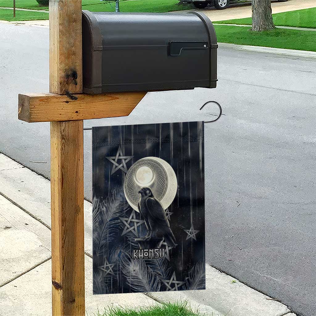 Khonsu Garden Flag Ancient Egyptian Dark Feather Pattern, Moonlit Raven Symbol, and Eye Lotus