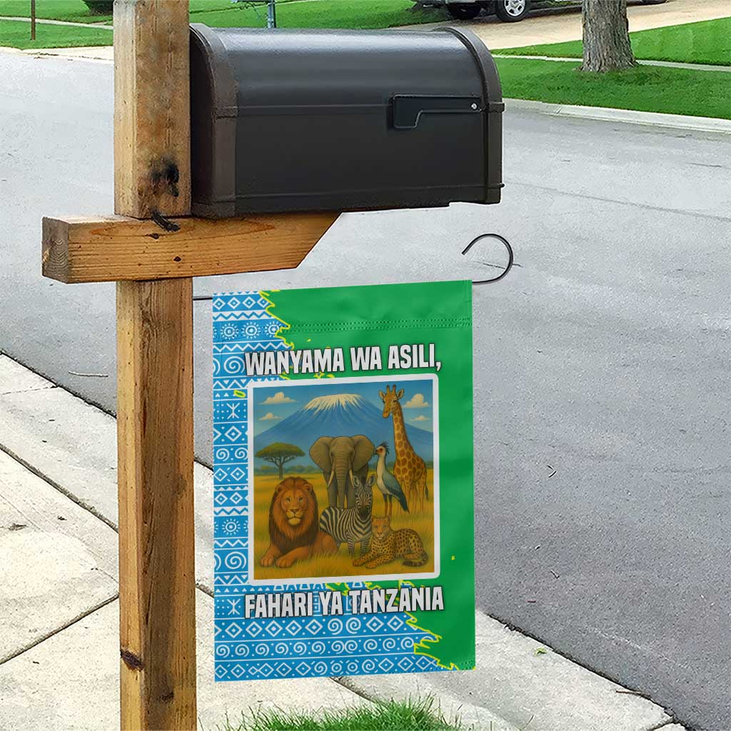 Tanzania Wildlife Garden Flag - Tribal Print and Mount Kilimanjaro Safari Scene
