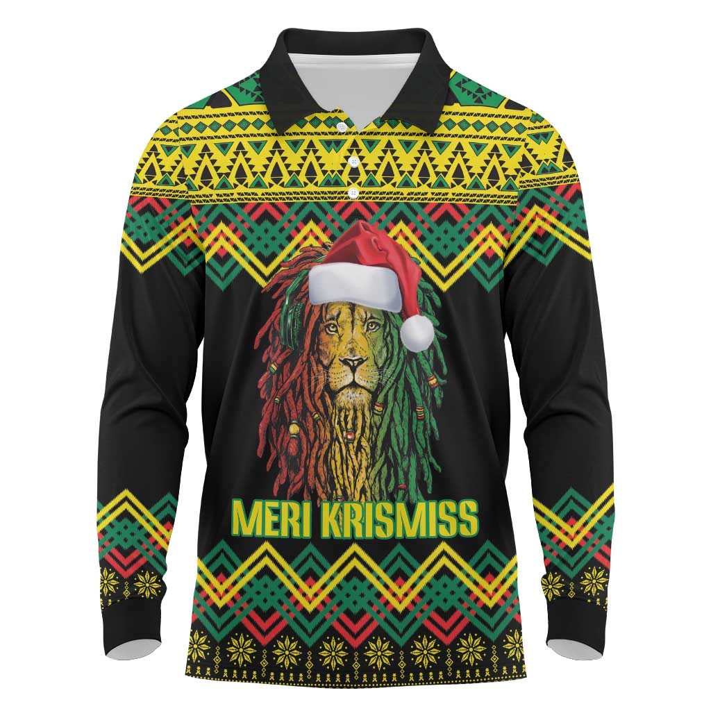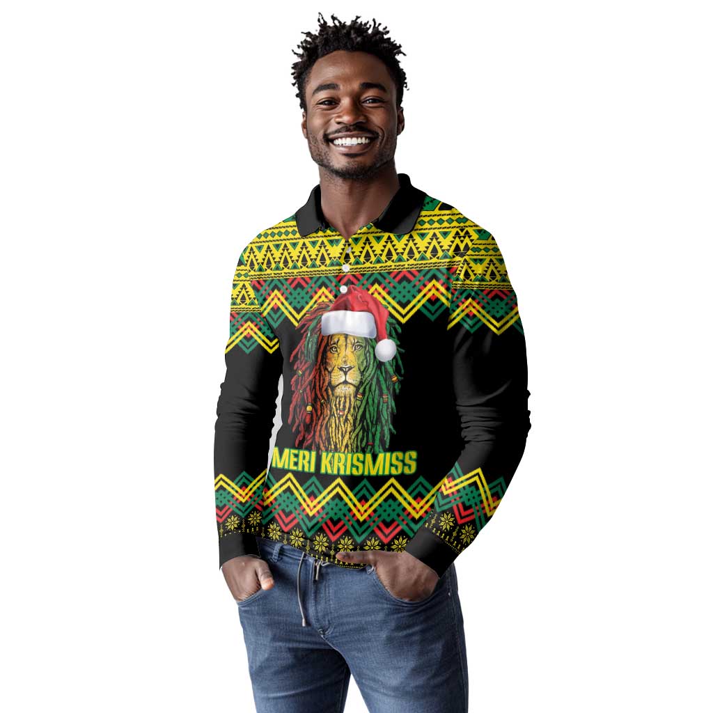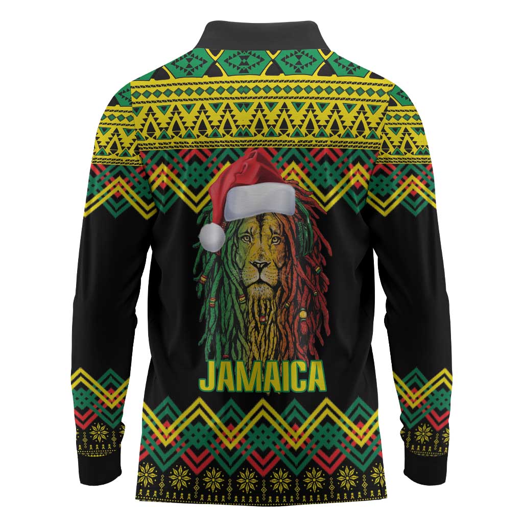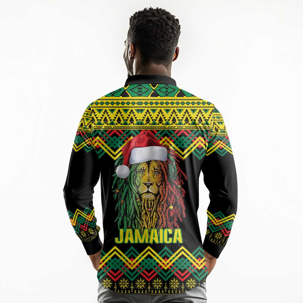 Black Jamaican Christmas Long Sleeve Polo Shirt Reggae Lion With Kente Pattern