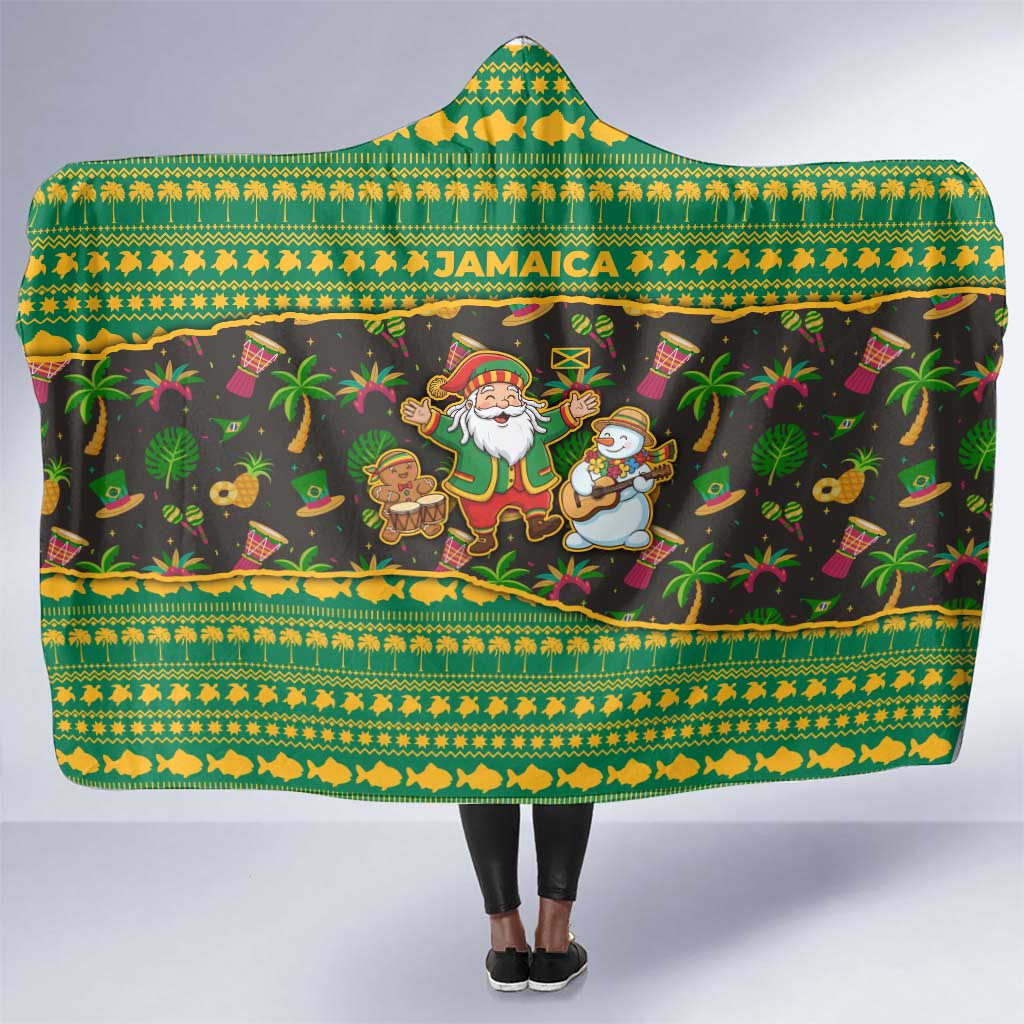 Jamaica Christmas Hooded Blanket Rasta Santa Snowman Gingerbread Drummer Palm Trees